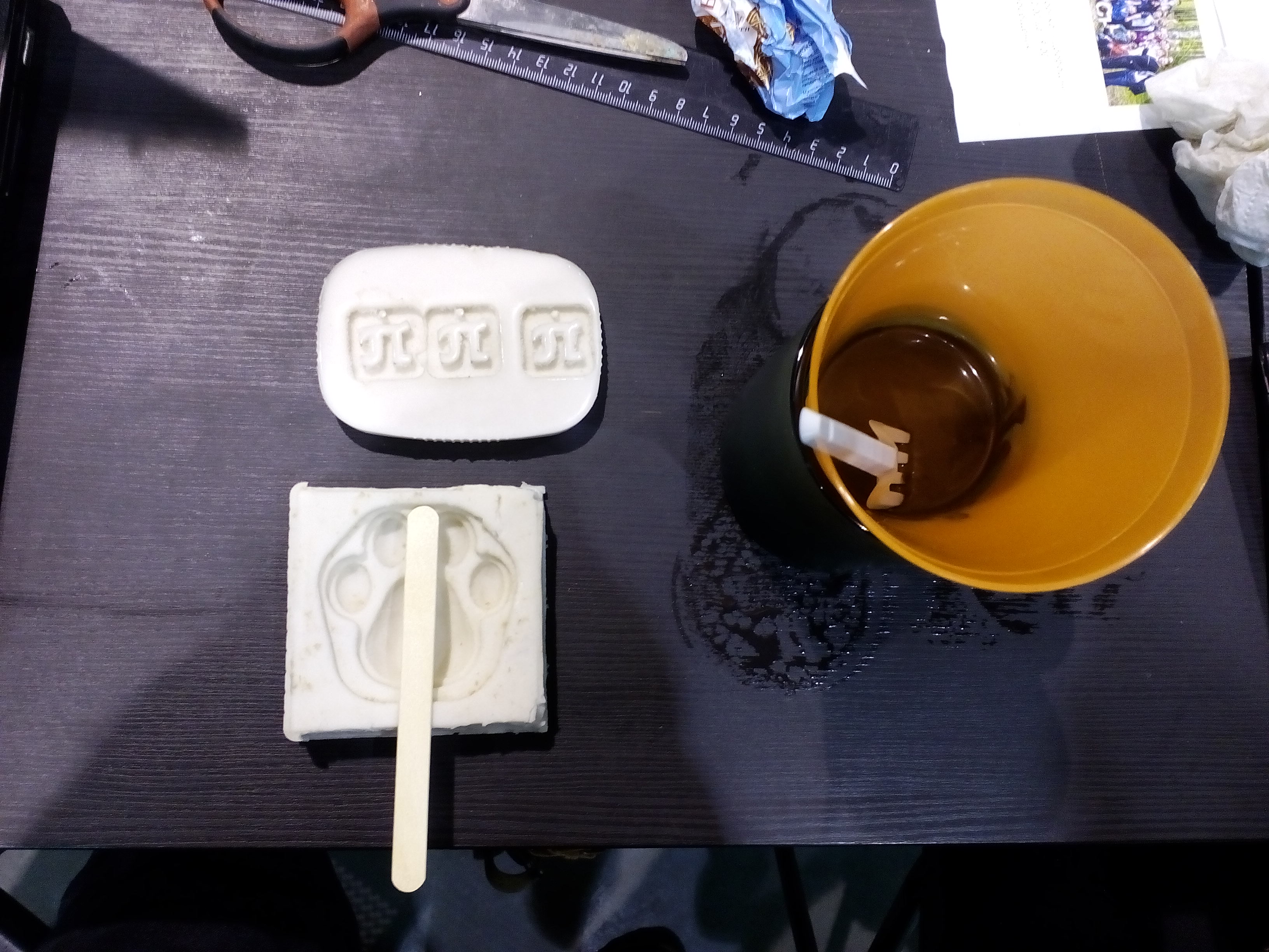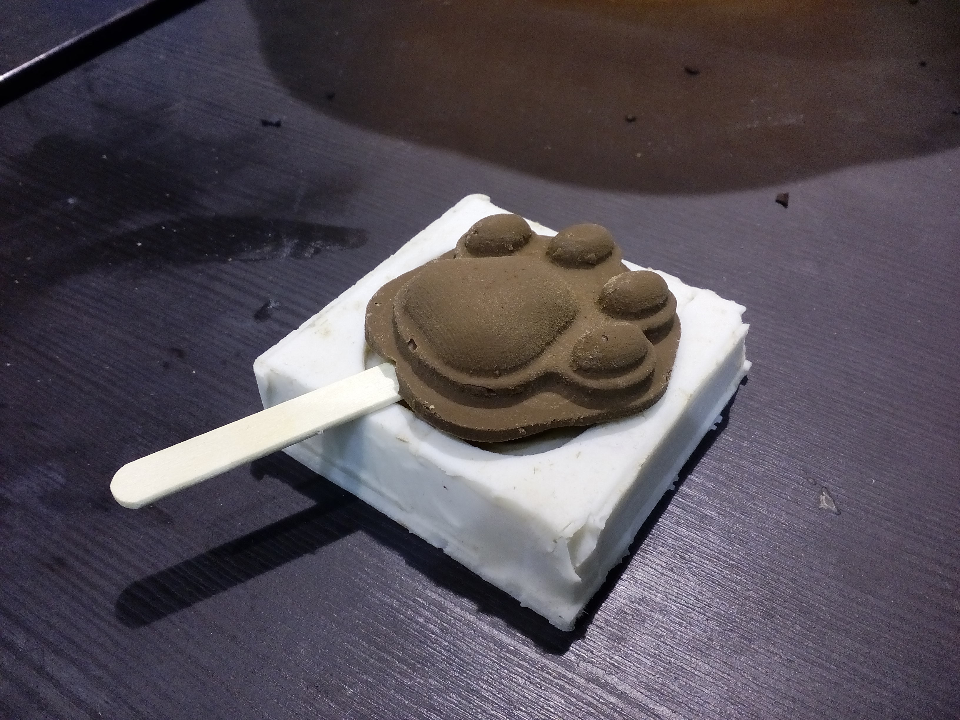 Чтобы растопить шоколад, я поставил его на водяную баню, затем вылил его в форму (не забудьте палочку!). В течение десяти минут шоколад застыл, и у меня появилась моя собственная лапочка на палочке. Ням!