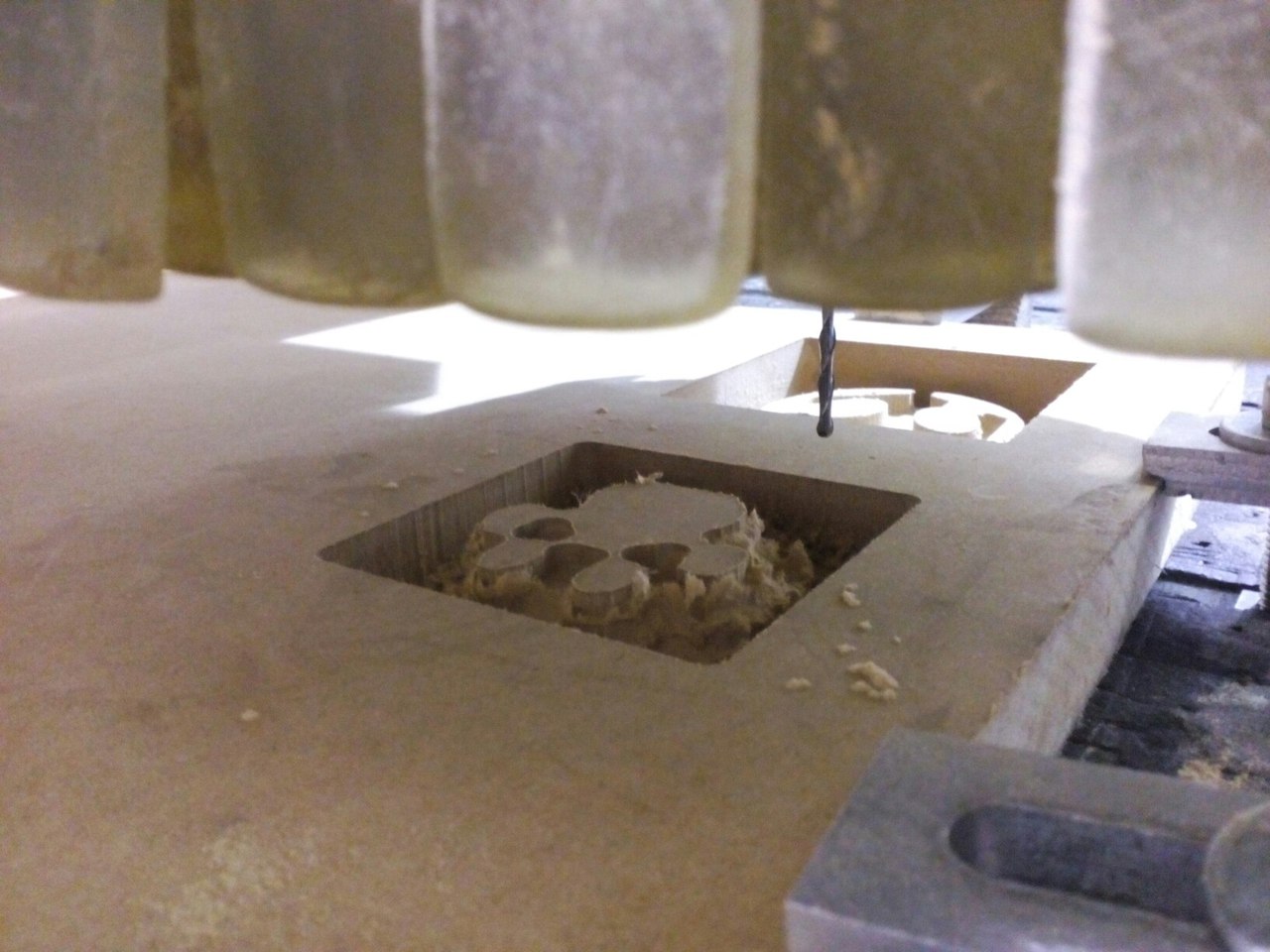 First, I had to make a solidworks model. The idea was to make a model of popslice which would be produced in the end then place it on the bottom level of thick material and drown it with silicone. Then, using ArtCam I made a program for cnc machine (I used Flexicam this time, btw) with 8mm end mill for goughing and 3.175mm ball mill for finishing.
