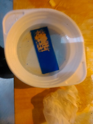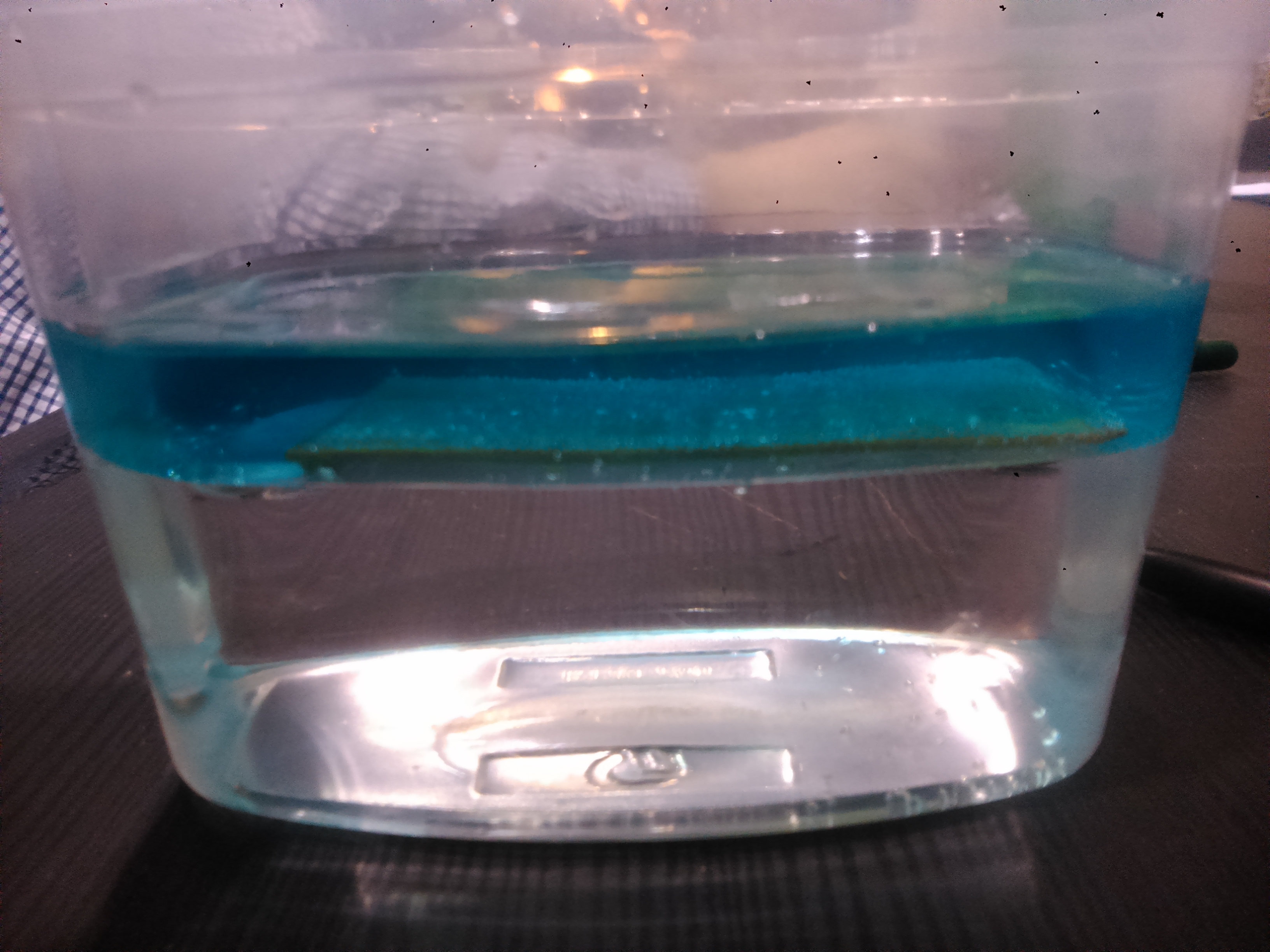 После нескольких попыток с лимонной кислотой я сделал плату, используя хлорное желело. Плата была сделана на замену нерабочей плате из задания 6 для выполнения задания 8. Для создания раствора смешайте в равных пропорциях хлорное железо и воду, подогревайте раствор до 40 градусов Цельсия; травление займёт около 10 минут.