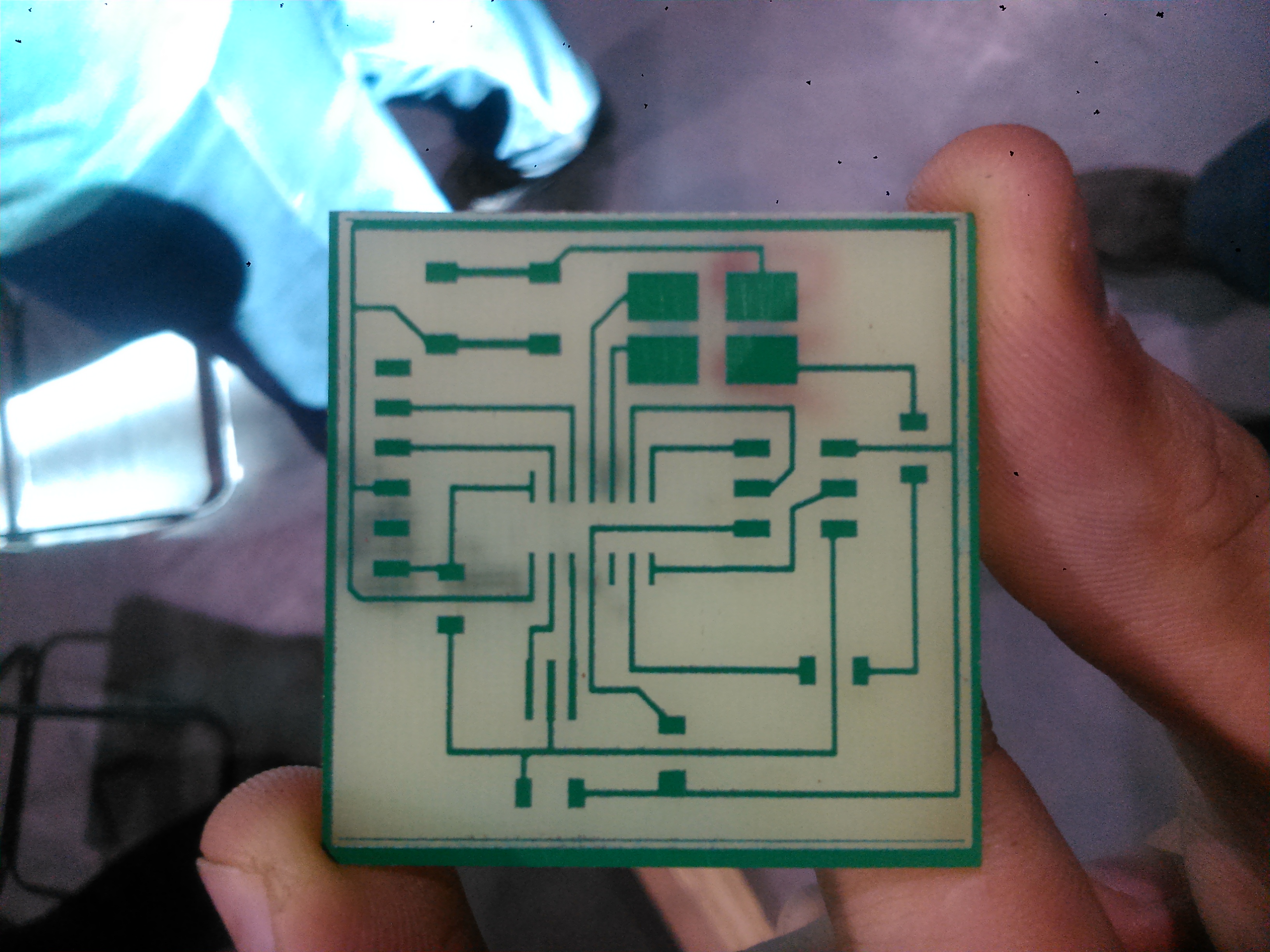 After a few tries with lemon acid I made a board using ferric chloride. I did it for replacing my week6 board to complete week9 assignment. To make a solution, mix ferric cloride and whater in equal proportions and also keep the temperature on about 40 degrees Celcius. The etching will be done in about 10 minutes.