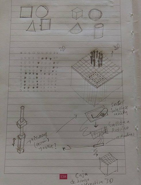 Ludic Box of tactile tridimensional conversion (aka BD3D) The goal is to convert a bidimensional drawing into a a tridimensional register by means of an interface of a tactile portable device (smartphone or tablet) in order to translate this drawing into a box with a reticule that would be able to represent this drawing in 3D trough a series of cilinders that move and conform using actuators/solenoids controlled by an arduino. By means of this box any basic geometric drawing done by children can be represented in this box with two goals, first is to achieve that a simple line drawing can be converted into a 3D model as a pattern of dots, the second one is to stablish precedents for a a future development of this device for larger and more complex objects promoting the understanding of a 2D drawing into a 3D model as a hardware peripheric transmitting in real time.