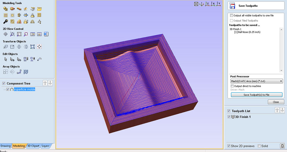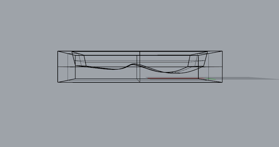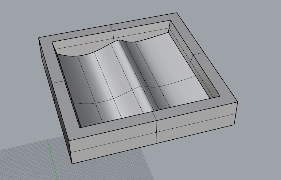 The first step was to model a surface in Rhino with the desired form, with that surface I started the design of the mold, I used tools such as extrude, join, booleans and some others to get the mold done. It's important to mention that the edges are slightly angled to permit an easy unmolding. To machine this mold first I exported the model in a .stl format, which is admitted by the software Aspire to perform the surface machining. After importing the model, I programed the machining, first is the rough process, in which I used a .25 inch cutter. The second step was programming the finishing, for this I used a .25 inch ball cutter. Both programs were ran separately to avoid some problems detected on prior practices.