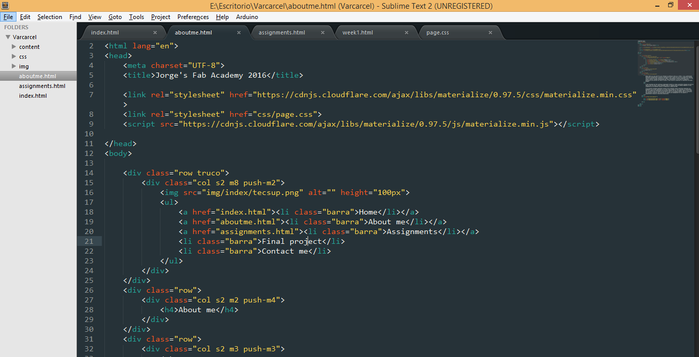 The first thing I did was to create a navbar (i just had to copy and edit some code) Then I designed some useful blocks of code for everything I needed (images, video, text) Once I did this I designed my principal pages and a structure for the assignments pages. Since I had all the structure done, i stoped worrying about web development, I just had to replicate the blocks and the basic structures.