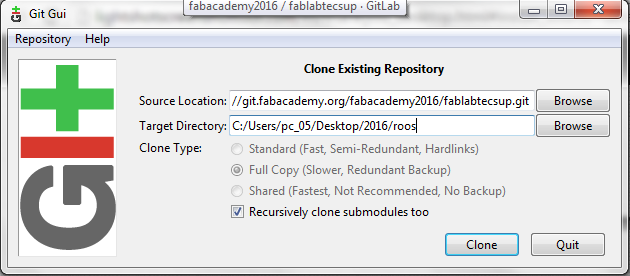 How can I upload my content to web? First I downloaded GIT FOR WINDOWS. After thad I logged In my gitlab account and obtained the source of the repository (using http) an chose a local target in order to clone it. Also you can see the option "recursively clone submodules too". It is checked by default, so i let it be. (submodules are the other repositories cloned inside this repo. I may clone other projects like frameworks, so thats another reason i let it checked.)