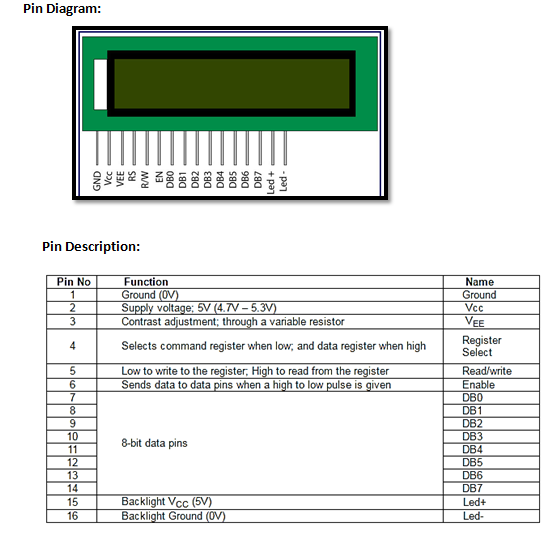 A 16x2 LCD means it can display 16 characters per line and there are 2 such lines. In this LCD each character is displayed in 5x7 pixel matrix. This LCD has two registers, namely, Command and Data.