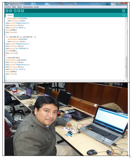 The objective of this programming is to visualize the temperature of the chimney furnace and to indicate us if we are to a low temperature (low temperatures to 200°C), comes up (temperatures between 200°C to 500°C) or high temperatures (higher to 500°C).