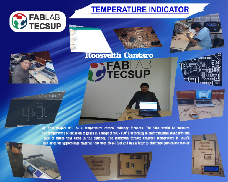 By making my final project, I learned develop an idea, uses of micro-electronic components: Electronic design, programming (I used the software IDE ARDUINO), Computer-controlled cutting and I used the fab-lab Tecsup machine, and more. With this instrument, I could measure temperature emission of combustion gases and I check with other the measurement instruments calibrated and little room for error ( 1°C).