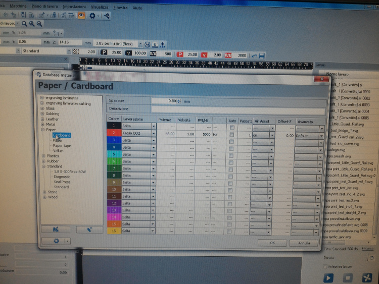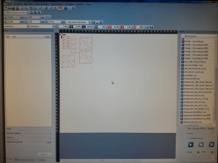 -Before pushing the "calculate" button, I set the output force(g)=70 and velocity(cm/s)=2, after calculating and saving the .camm file, I launched the commands to communicate and finally cut the design for good.