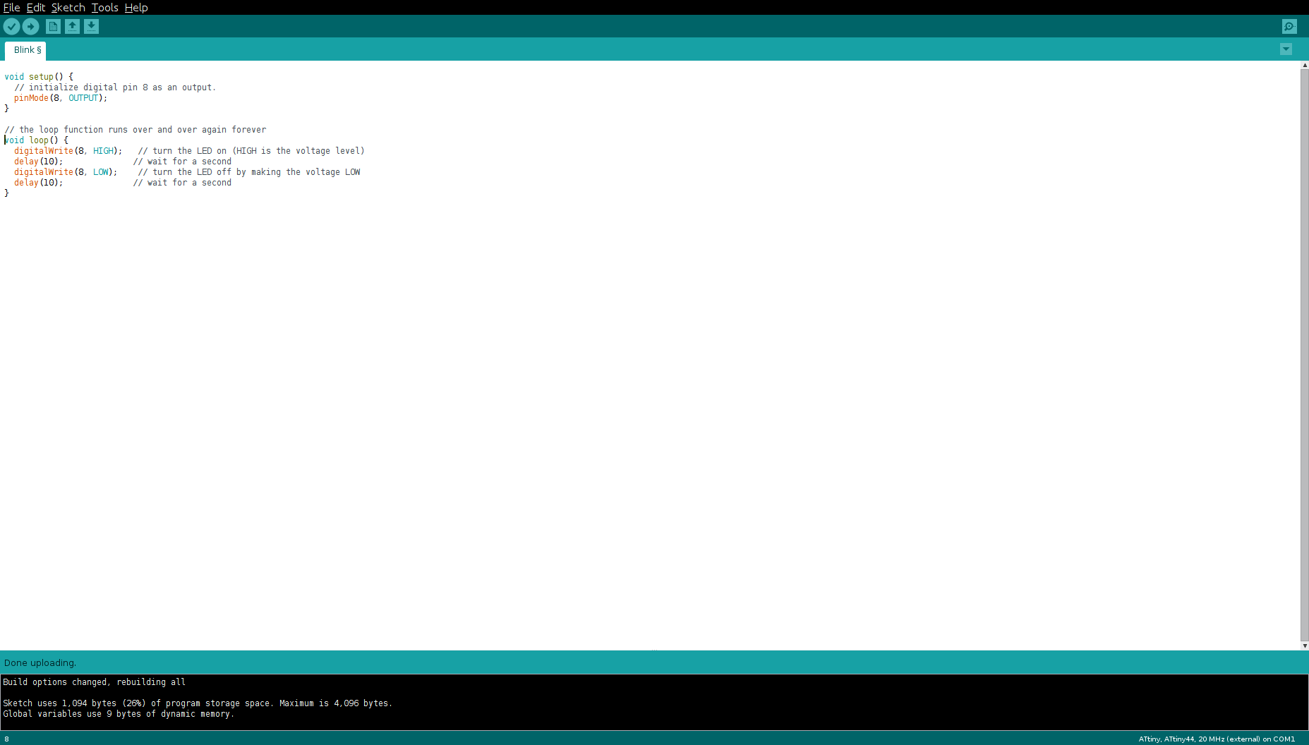 -Once I set the IDE to work with ATtiny(s), I took the basic example program to make the led blink on my Hello Board, just to make sure that everything was working accordingly, also had to change the pin output from 13 to 8 and not to 5 as I thought.