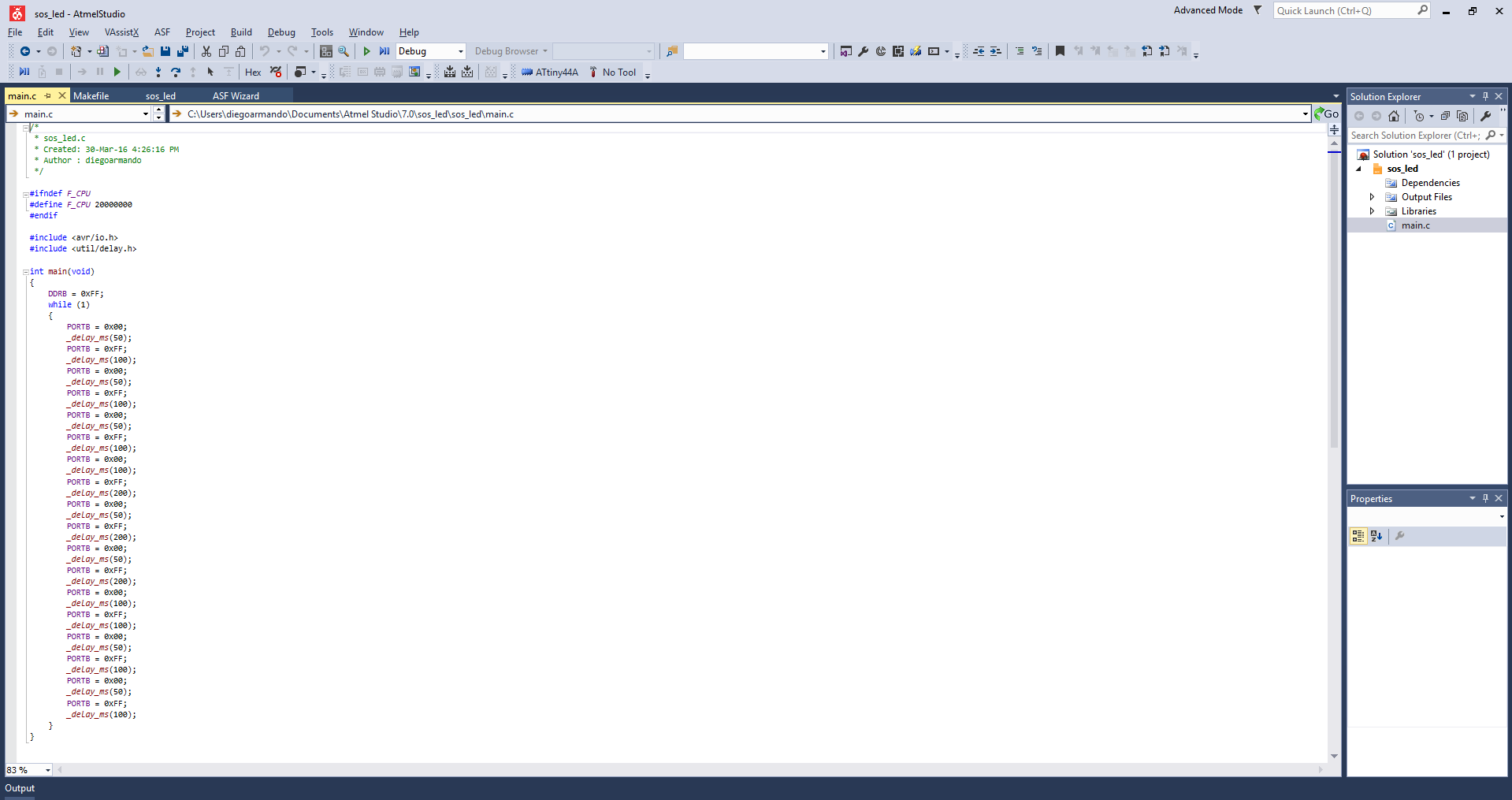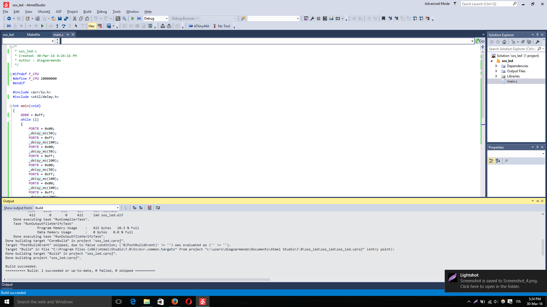 -At the end, I created my .c file for the sos led signal by inserting an infinite loop, setting all Data Direction Register of port B to output, synchronizing the led delays to simulate the Morse Code and finally uploading it to the Hello Board.