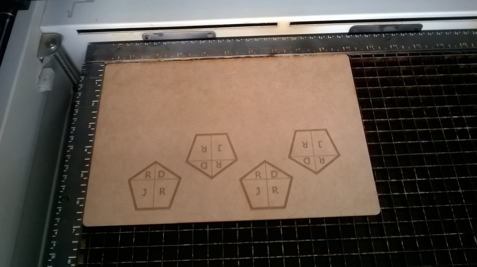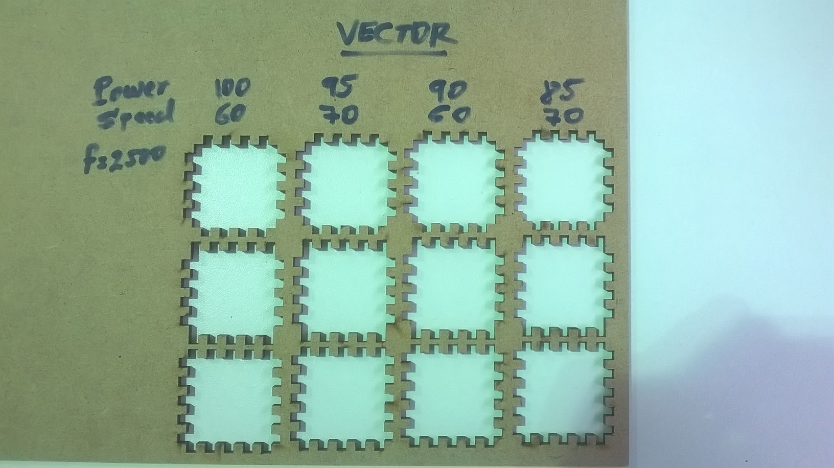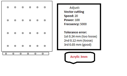 It is neccesary to introduce some errors of cutting because it has some variants: the cleaning of the machine, the thickness of material, the parameters like power, speed and frecuency of cutting; in this project I explored many options and the final cutting is showing below: