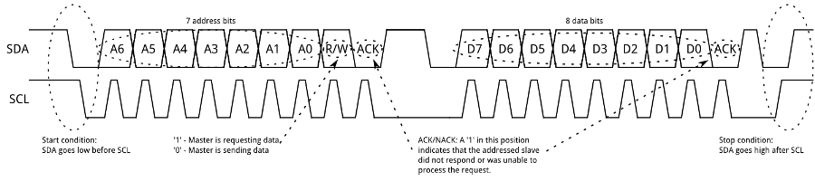 Before starting with some test I tried to understand how the I2C protocol is working. There are lots of explanations on the web, from Wikipedia to Sparkfun's tutorials. The most interesting theoretical aspect it's been to understand what it means to transmit bytes and which is the function of the clock.