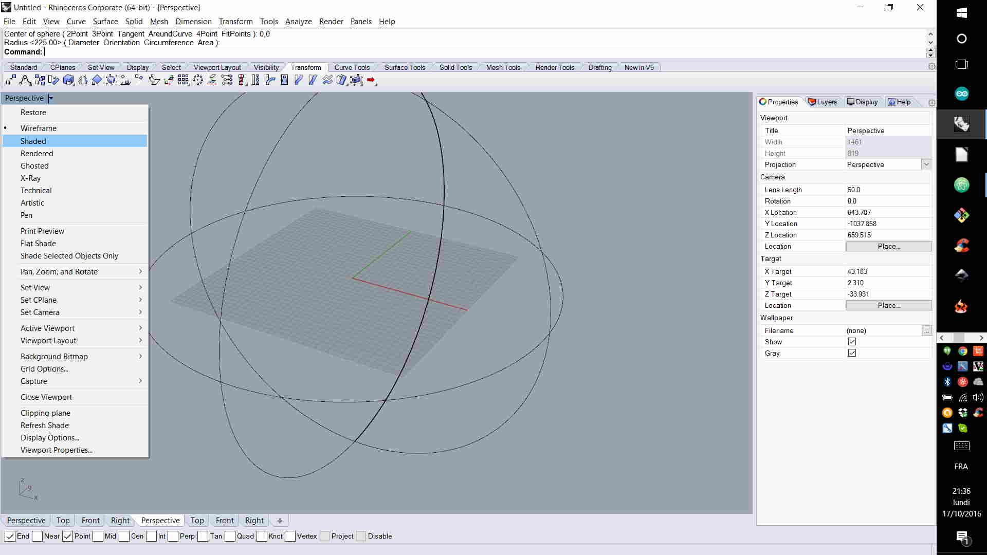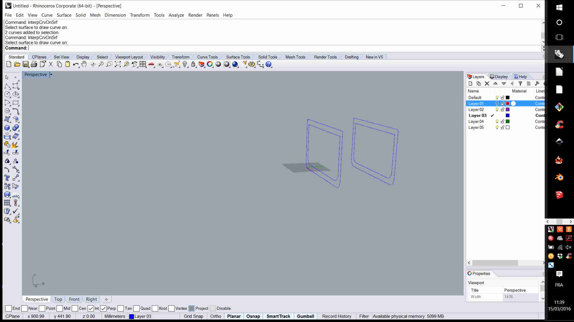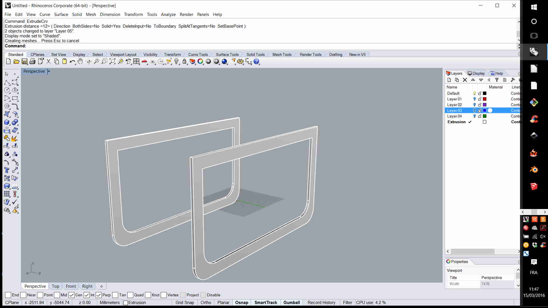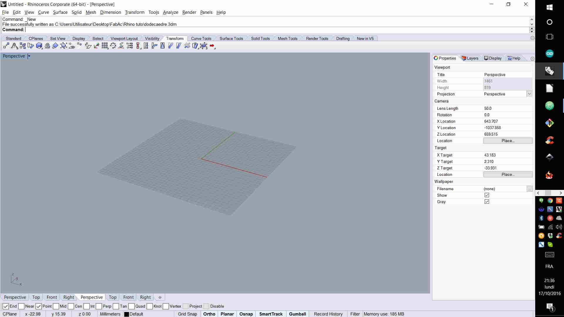 When you open rhinoceros 3D (we always work in large objects, millimeters), your workplane will look like 4 screens. You can choose one by double clicking on one. It looks like that when choosin perspective.