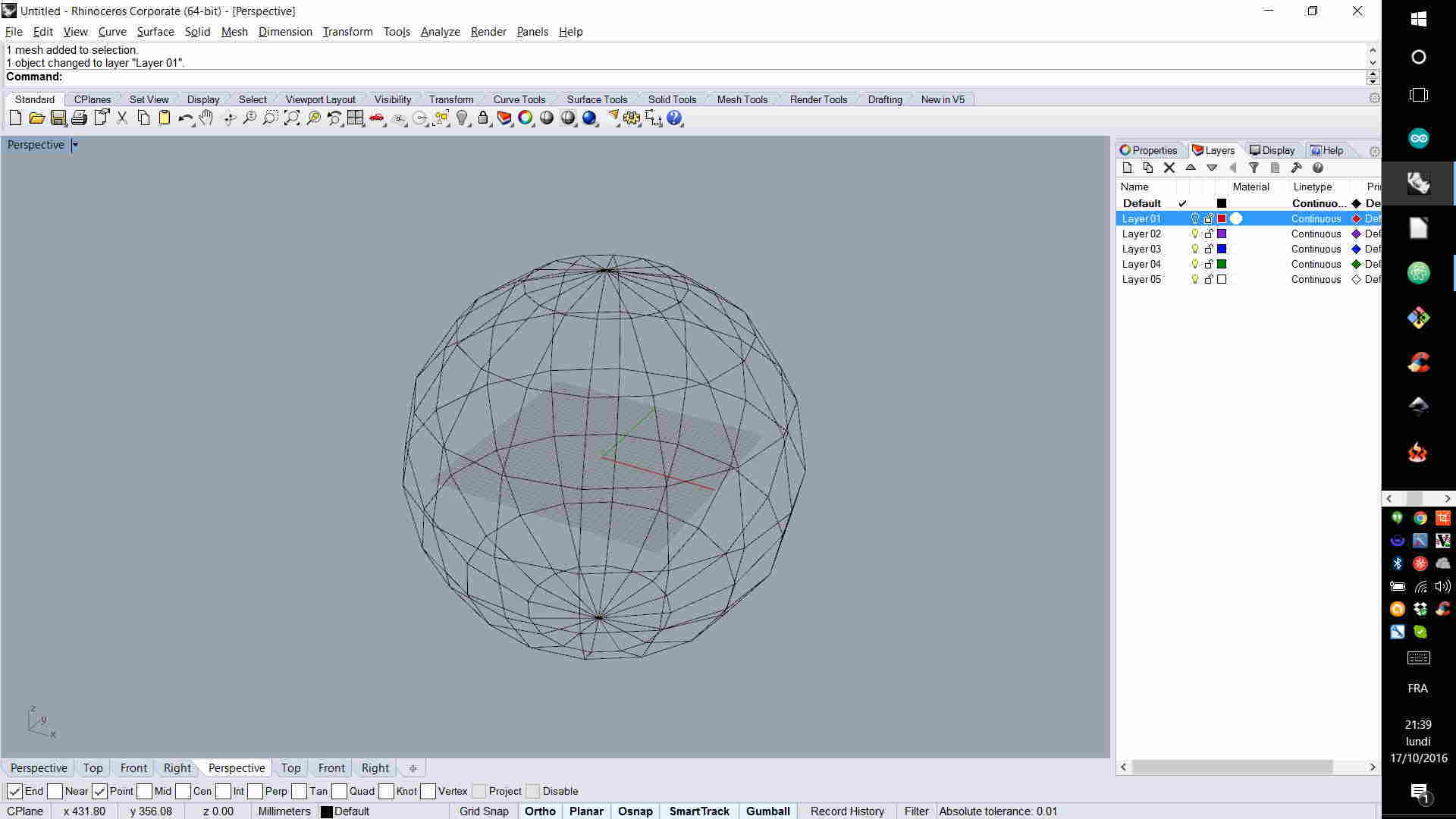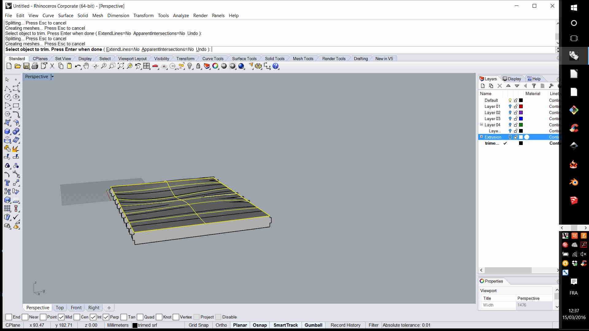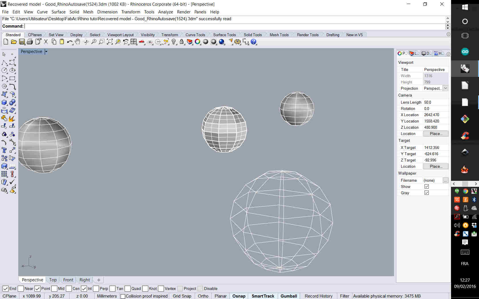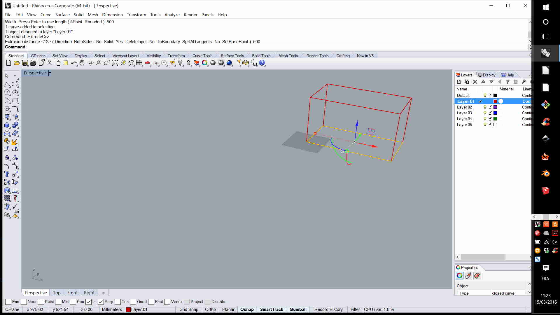 When you open rhinoceros 3D (we always work in large objects, millimeters), your workplane will look like 4 screens. You can choose one by double clicking on one. It looks like that when choosin perspective.