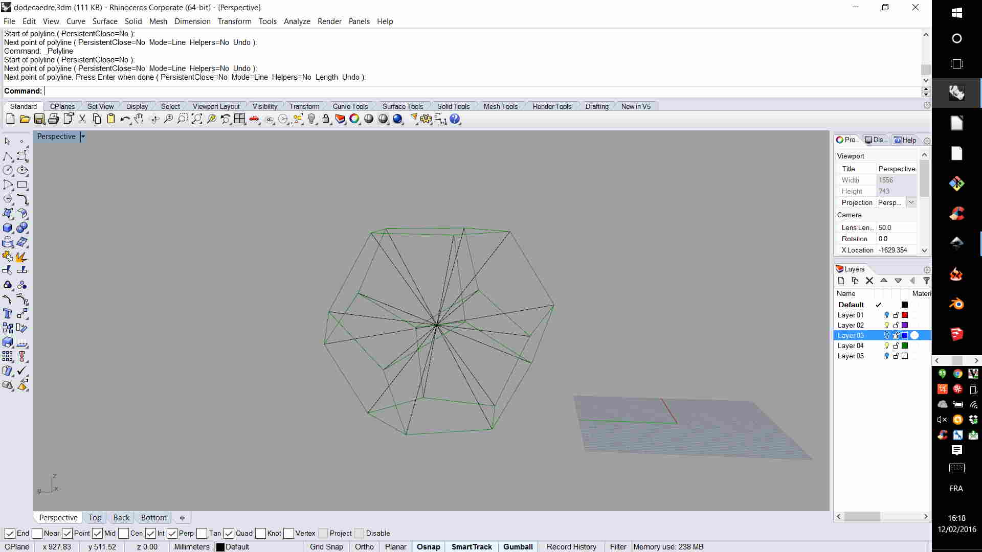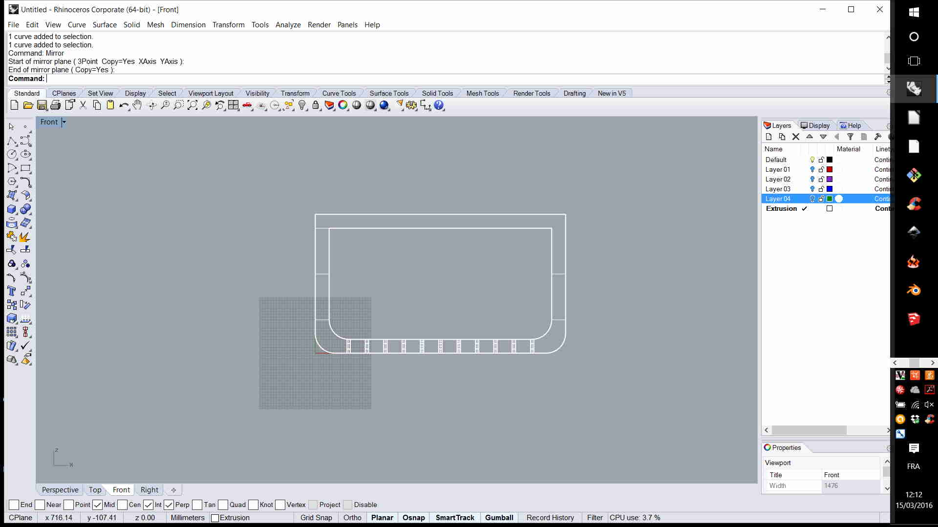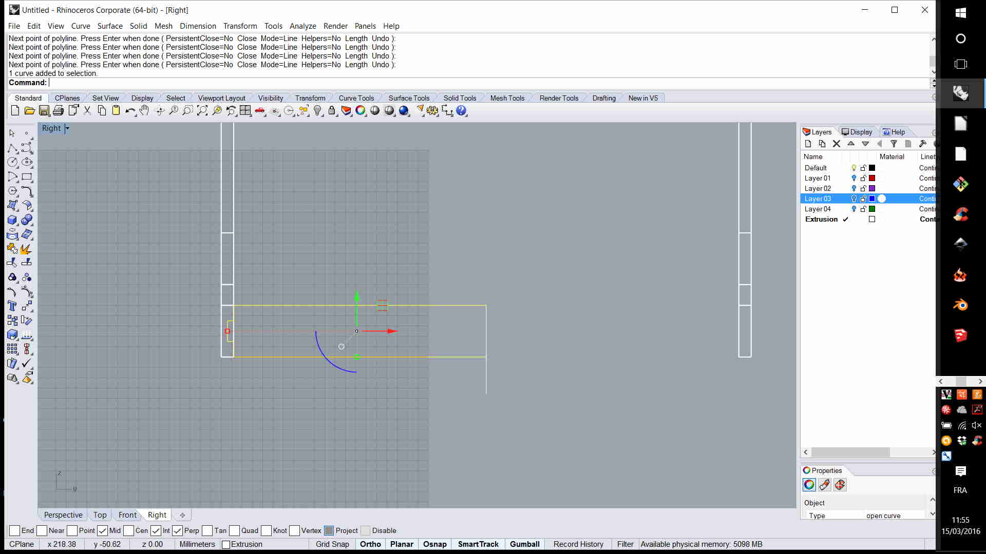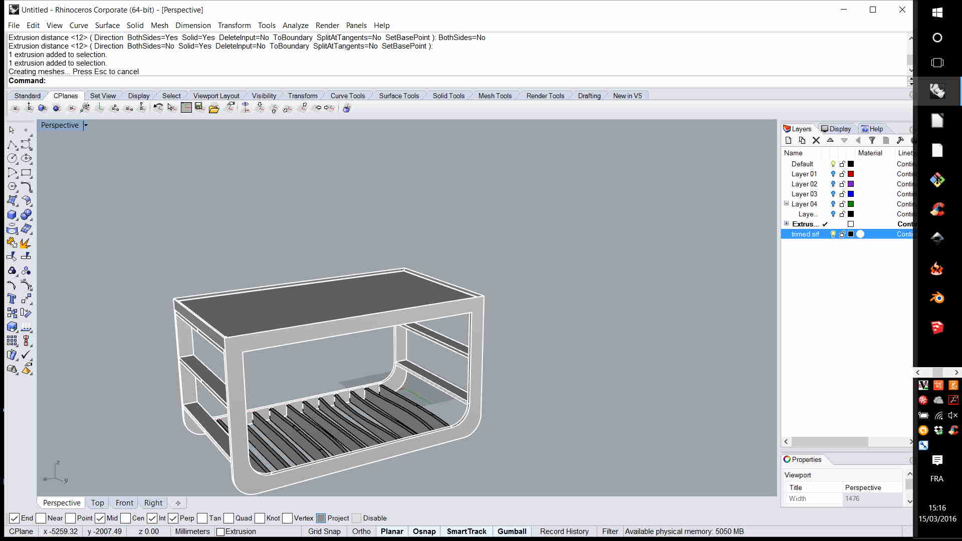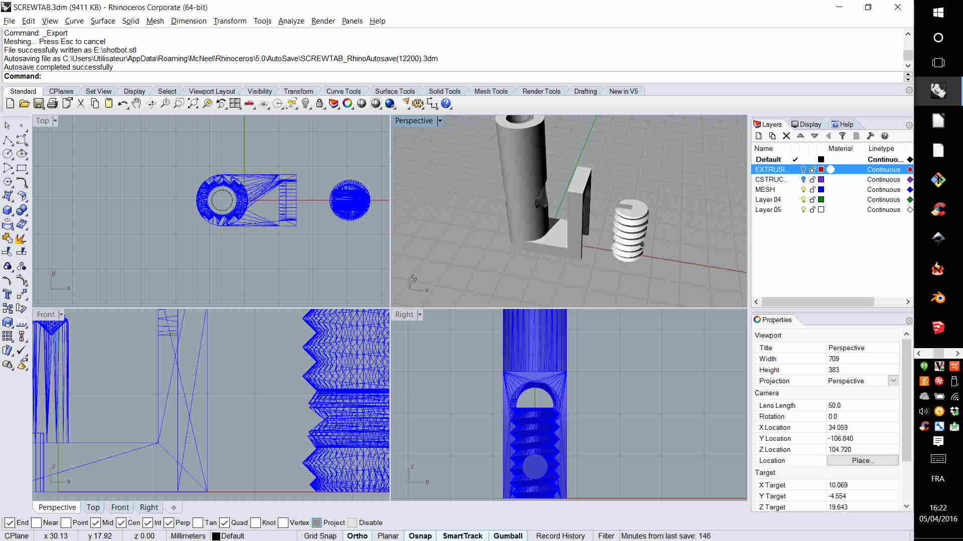 When you open rhinoceros 3D (we always work in large objects, millimeters), your workplane will look like 4 screens. You can choose one by double clicking on one. It looks like that when choosin perspective.