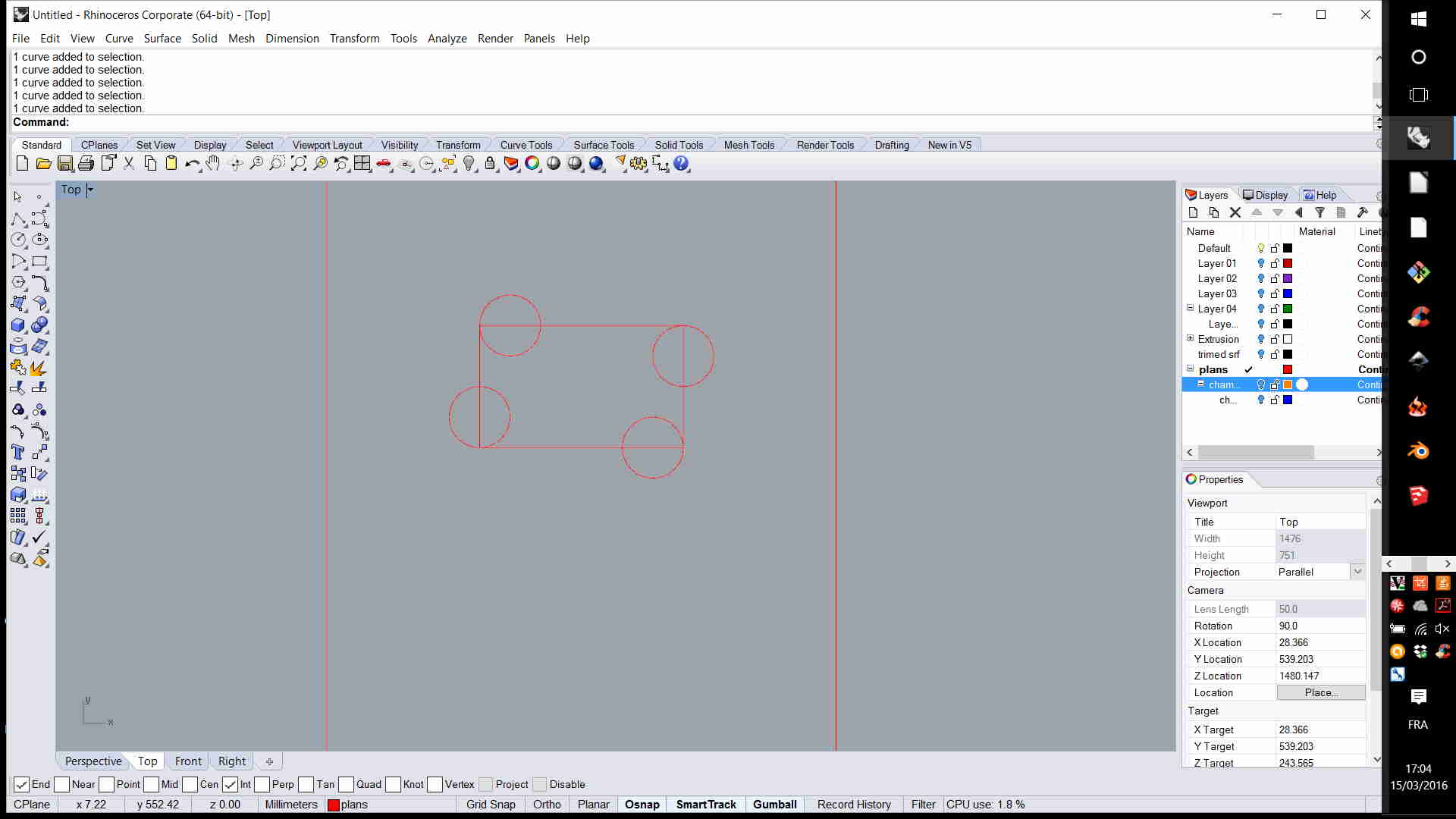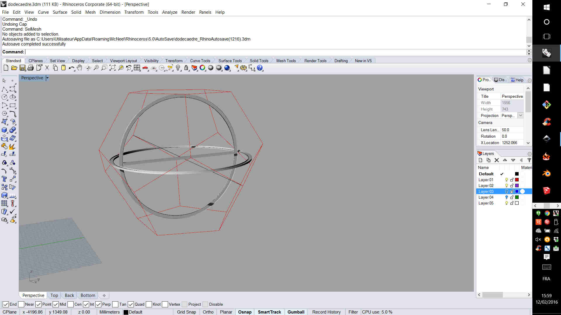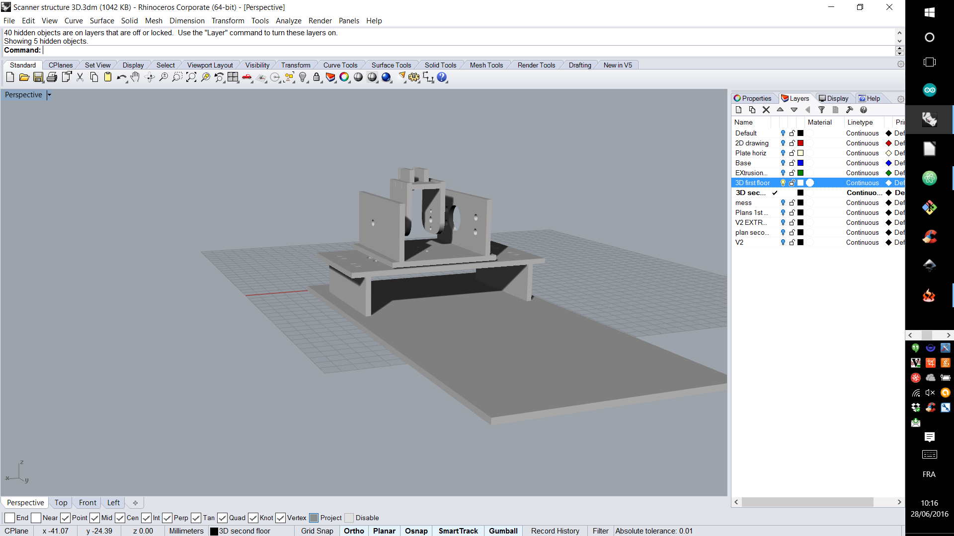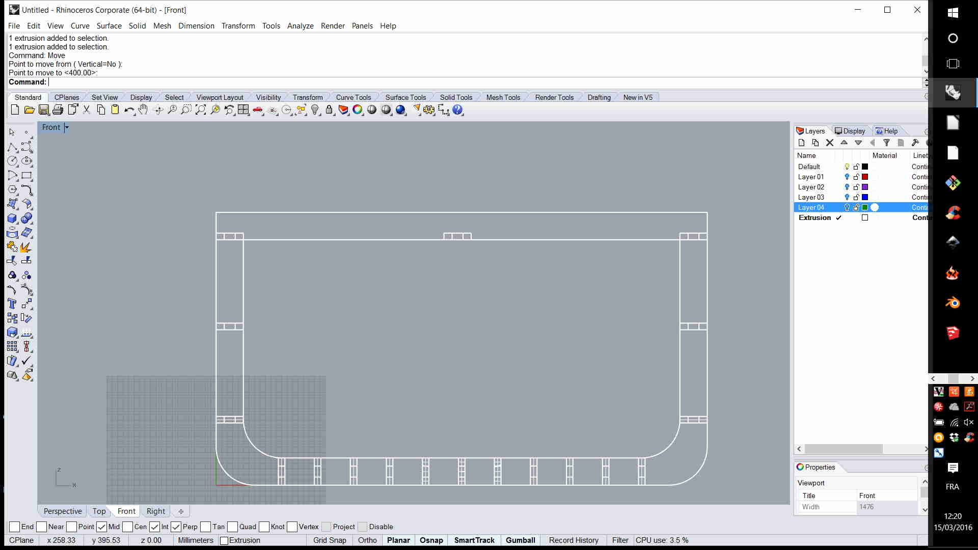 When you open rhinoceros 3D (we always work in large objects, millimeters), your workplane will look like 4 screens. You can choose one by double clicking on one. It looks like that when choosin perspective.