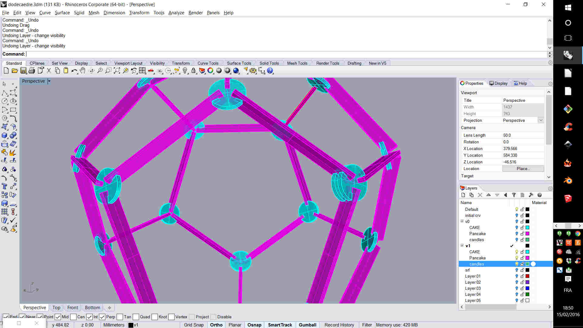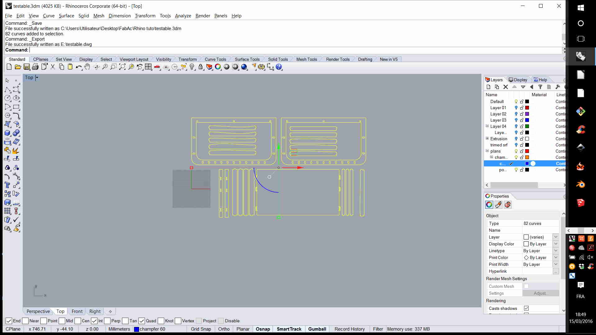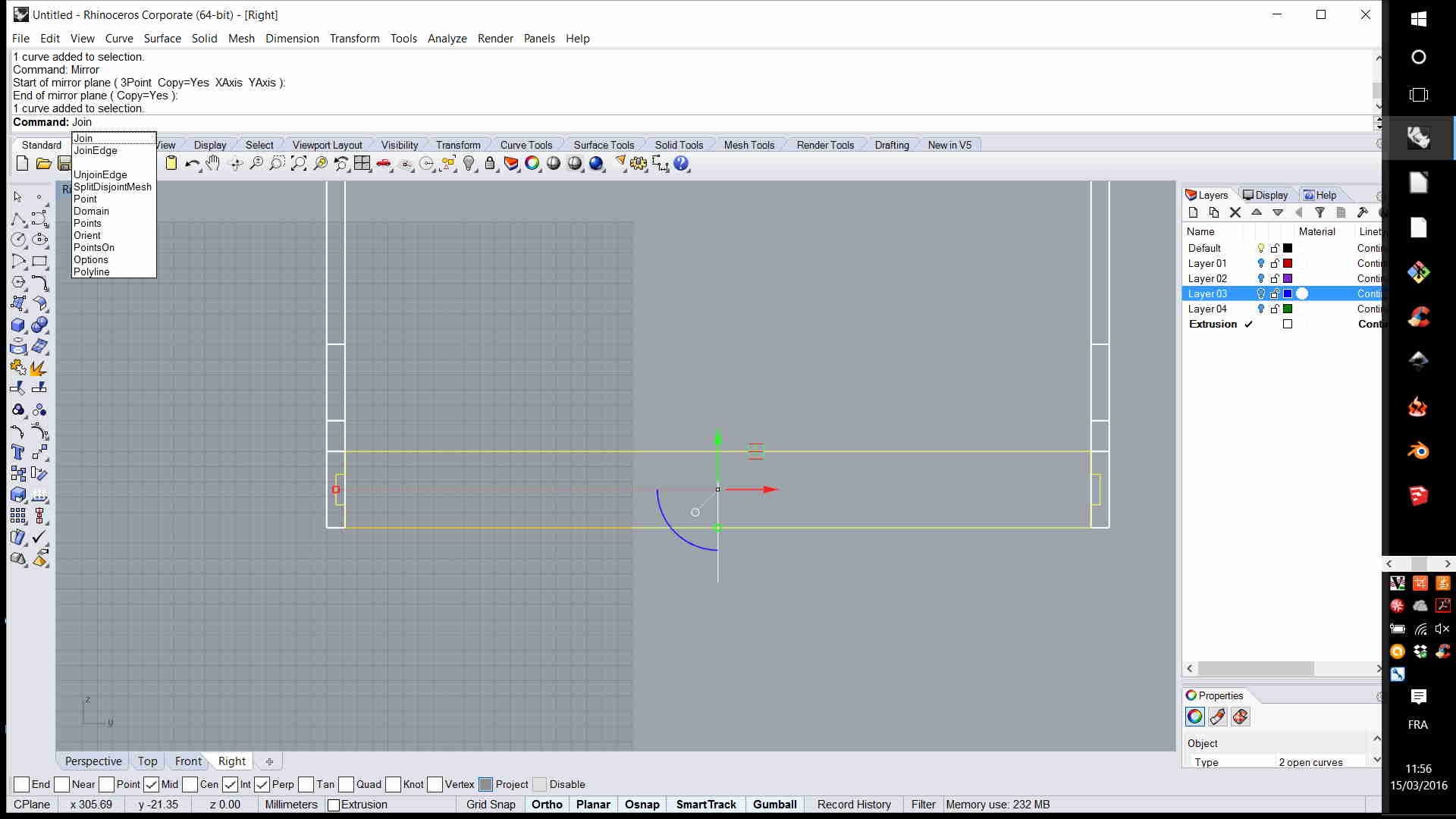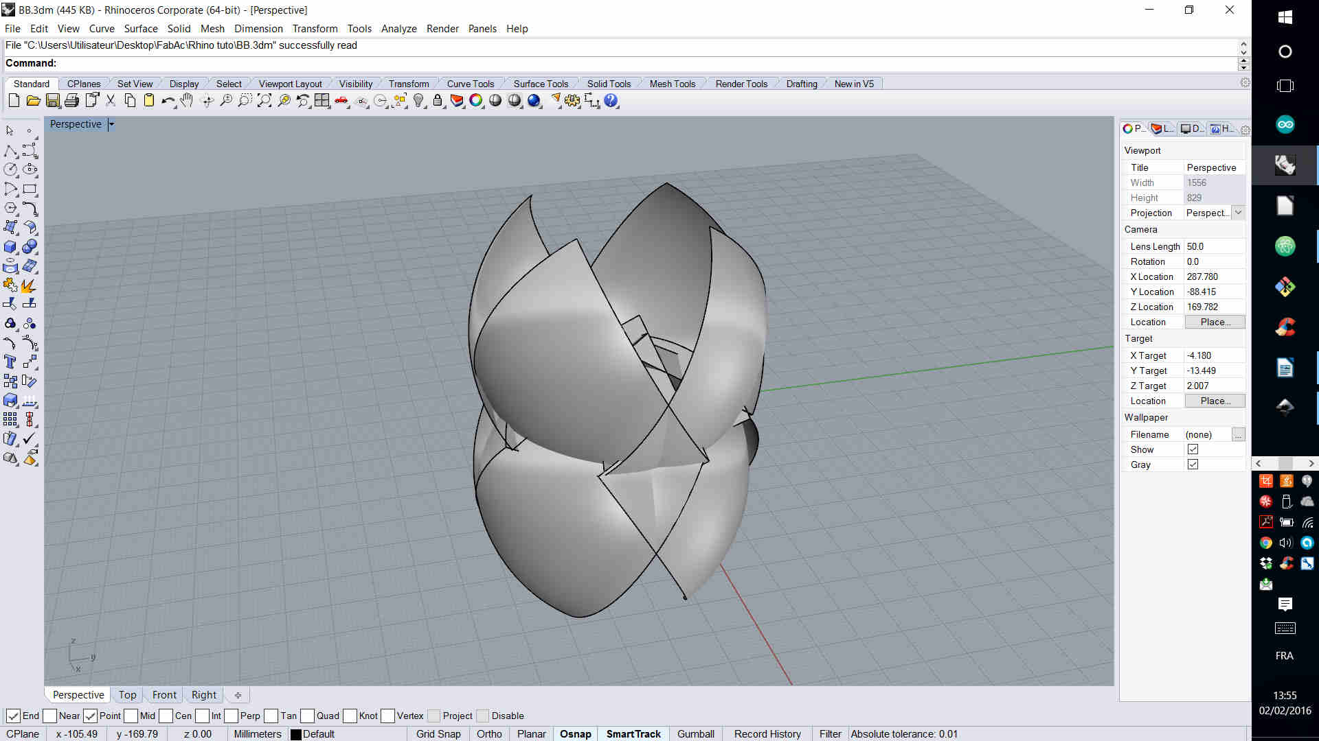 When you open rhinoceros 3D (we always work in large objects, millimeters), your workplane will look like 4 screens. You can choose one by double clicking on one. It looks like that when choosin perspective.