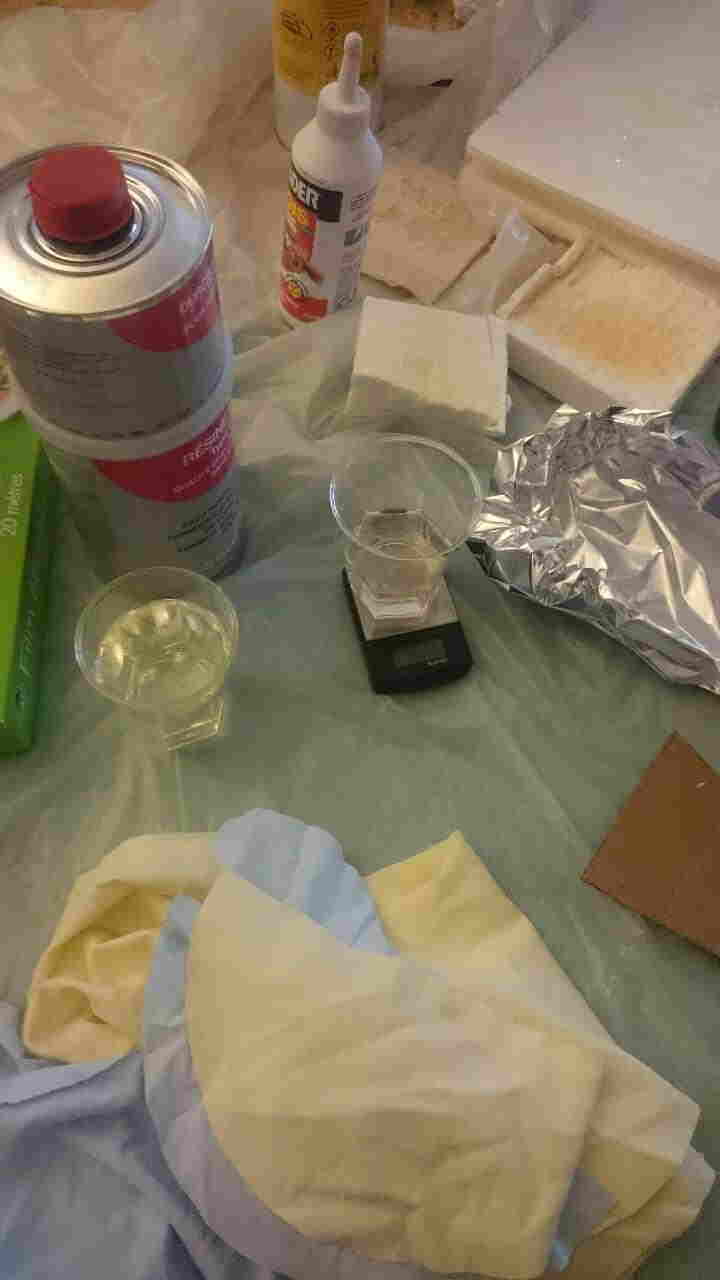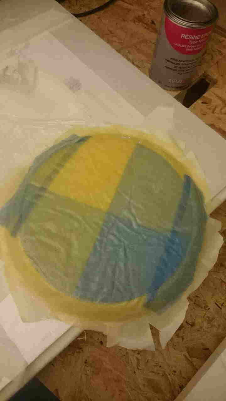 Then, it is very similar to preparing material for a mould. You mix epoxy and hardener in proportion, so as to have your resin.When everything is ready, you add layer by layer your resin full material. We do not have pictures because of our hands in the fabric and epoxy. we do apologize.