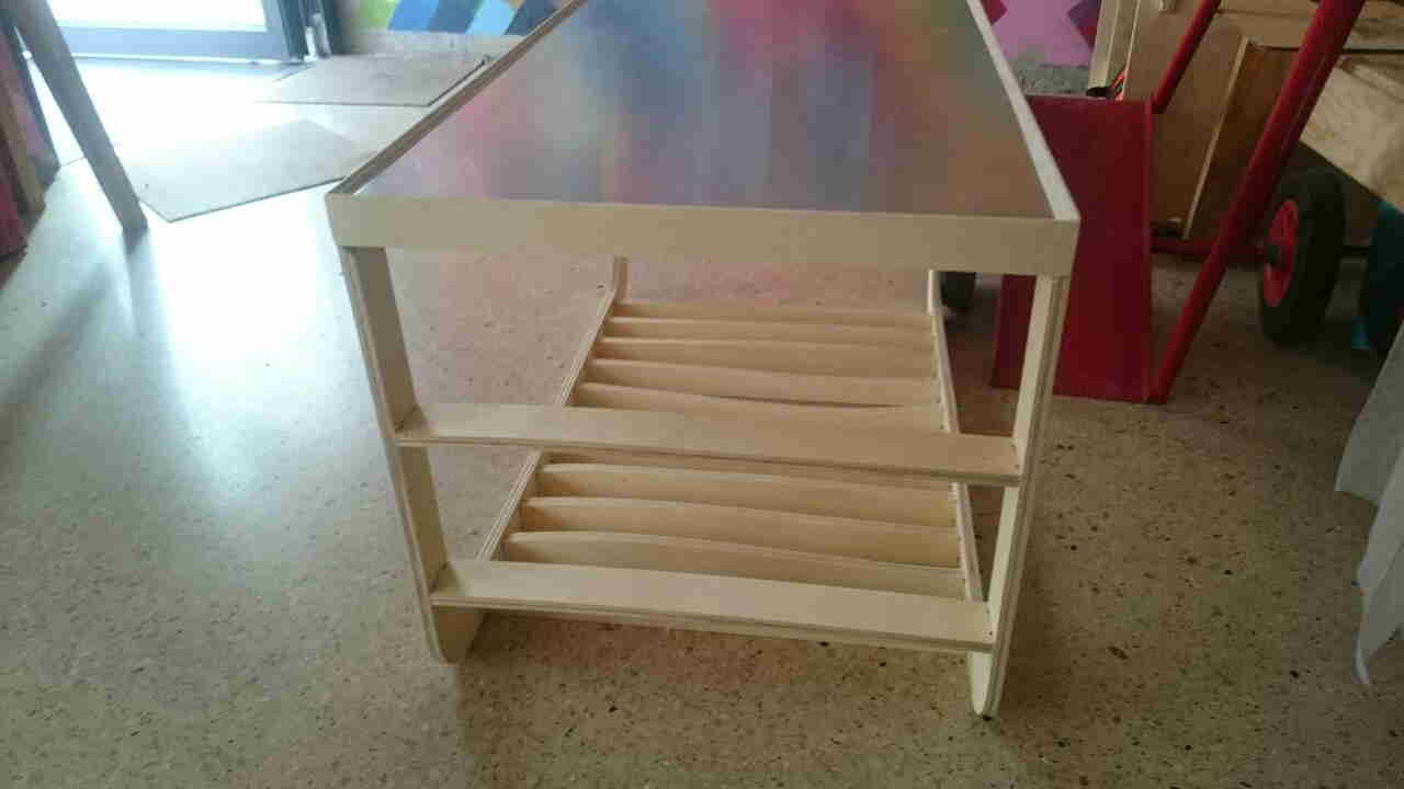 We designed this on rhino for 3.8mm plywood.File attached here. There are two devellopement steps. One prototype, very squared, called V1, V2 is more round and is the final version of the project.
