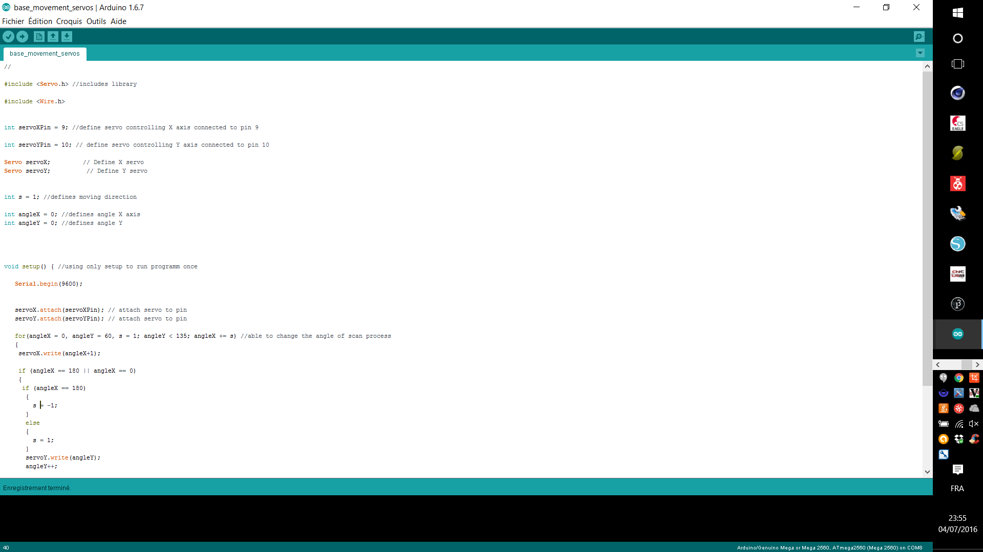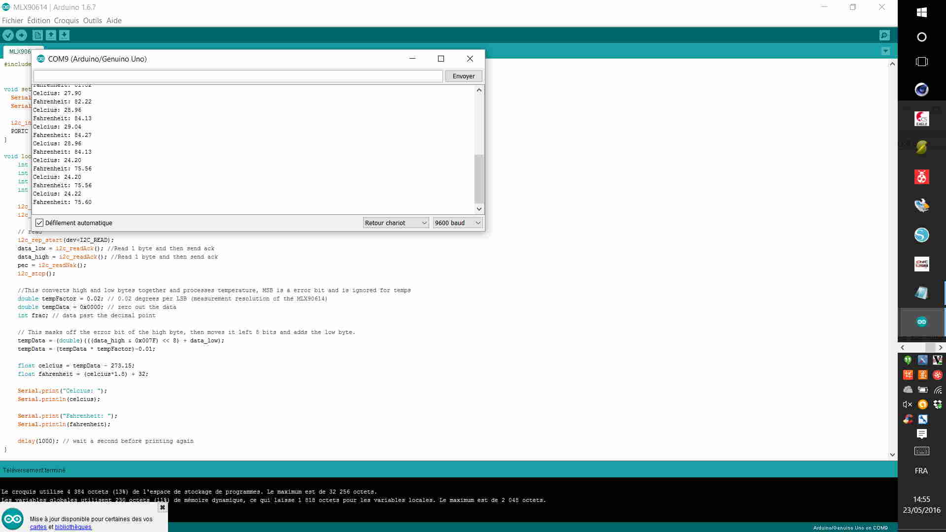 We did code this device with arduino code (.ino). To scan, you need the X Servo to move degree by degree to 180°, and back.Also the Y one to move one degree everey 180°. So as to have a temperature reading, you need to read the sensor between every step. Above, you have the reading of degrees and temperature in °C and F.This reading uses the exemple in AdafruitMLX library.