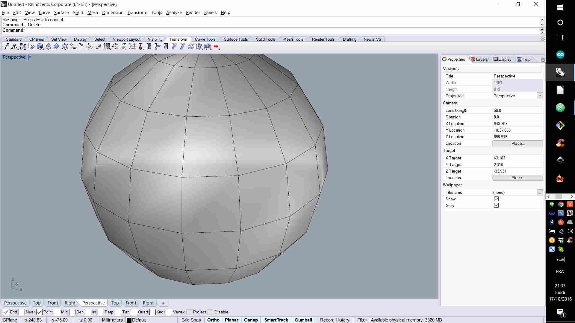 To draw this envellope, first, you need to draw a sphere. In Rhinoceros 3d, it will be made out of nerbs, and look like that.