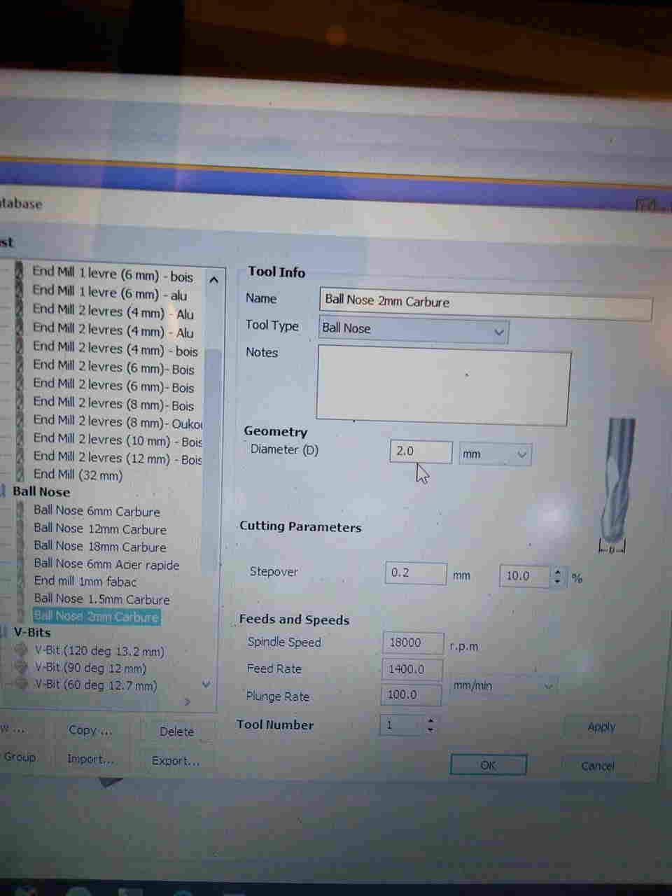 We did use a 2mm ball nose, with a 0.2mm stepover. RPM are the same (18000), but speed and plunge rate are different (1.4m/mn feed rate, 0.1 m/mn plunge rate).