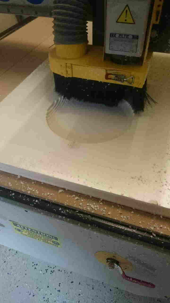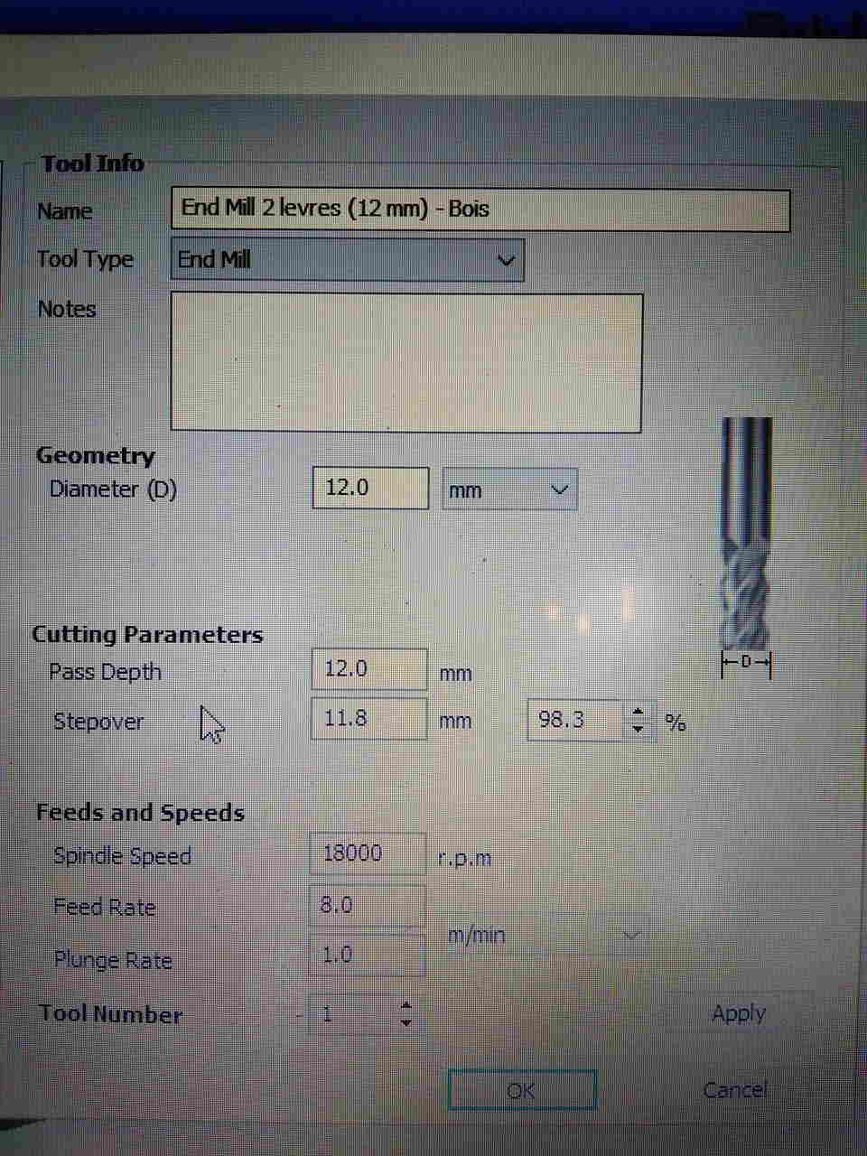 Roughing was done with a 12mm, two lips, end mill. Pass depth and stepover are really bi, so be careful when using same parameters. they are calculated for light foam molding. Feed rate was not that fast thought (8m/min), to keep a maximum of precision. Spindle speed is 18000rpm, as preconised for this type of tool.