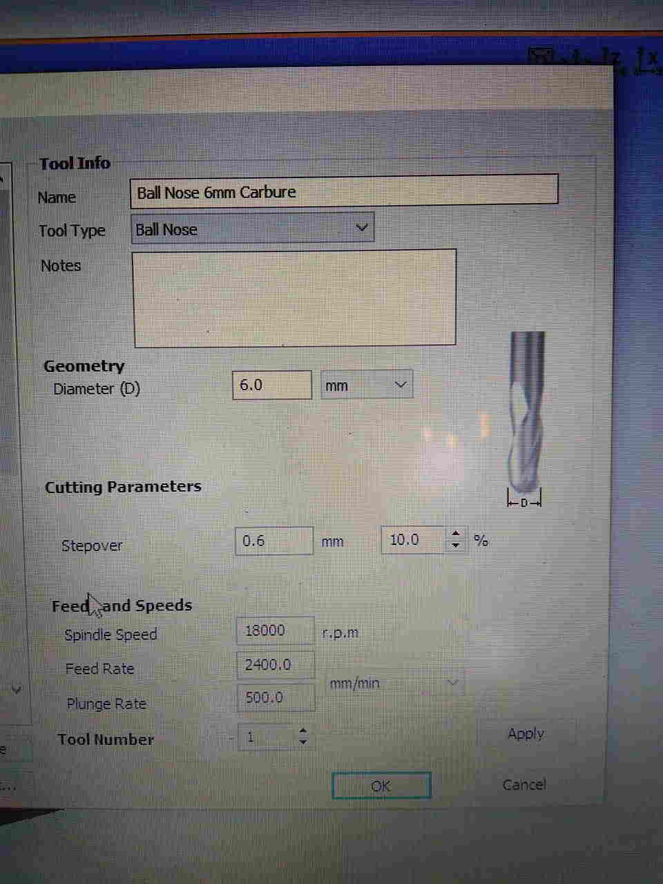 We end up by choosing the tool and it's speed. In our case, it is a 6mm end mill, spinning at 18000r/mn, and moving 6000mm/min. Spinning speed is casual for this tool. As for advance and plunge rate, they are proper to the wax, and to this phase. We'll see later that for finish pass, we use a lower moving and plunge rate, because we need more precision.
