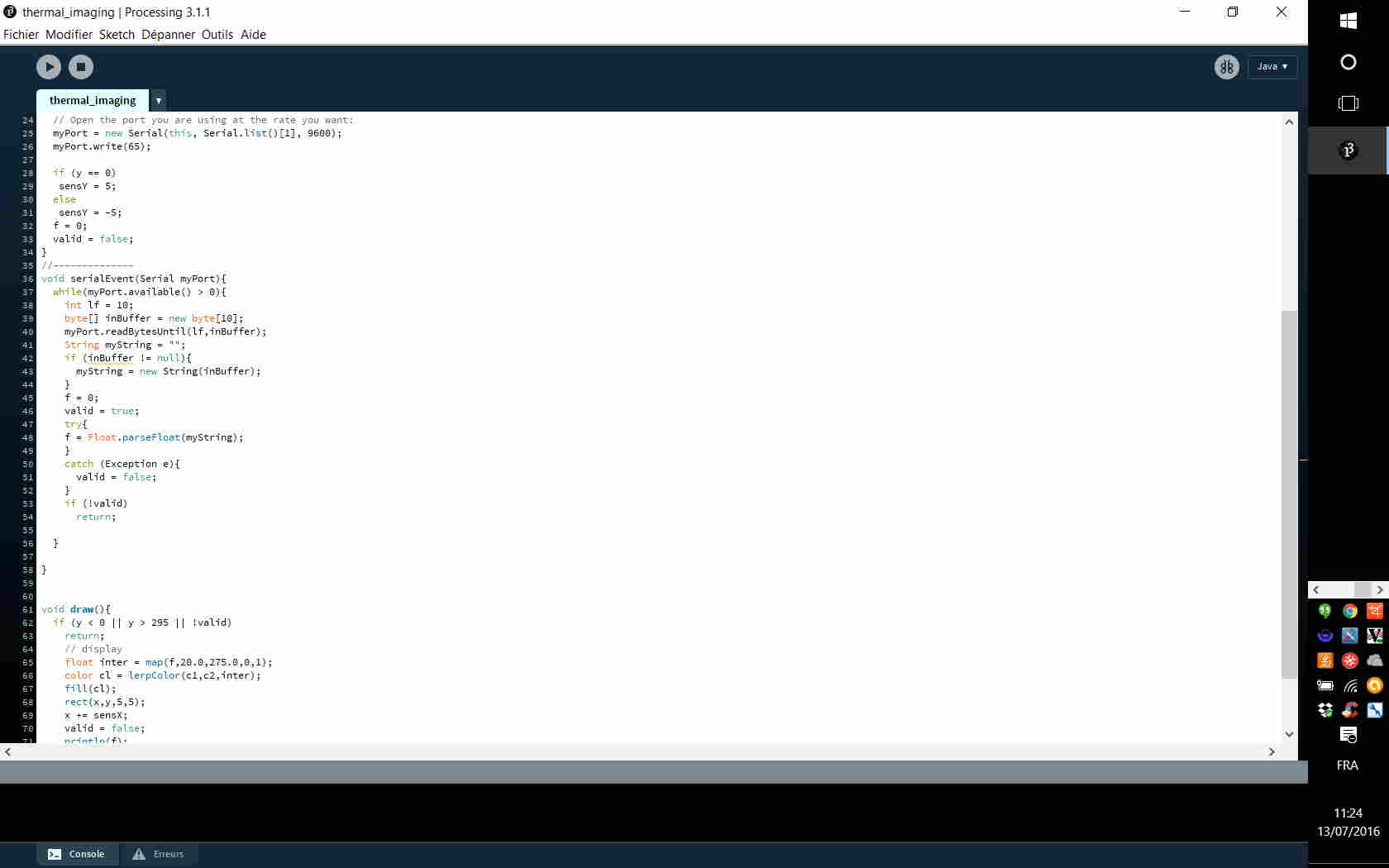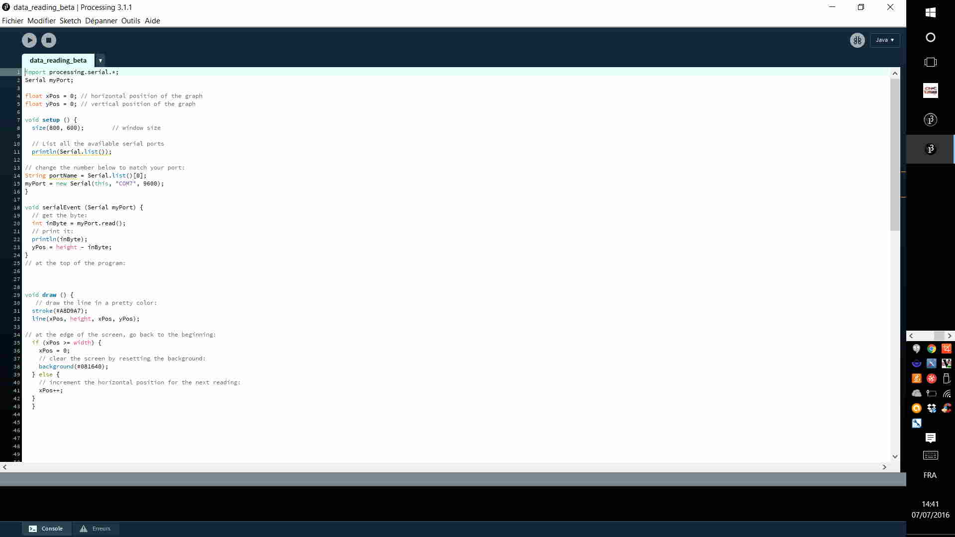 First reading we had was with Arduino serial monitor. We decided to try to use processing. It looks like arduino IDE. In fact, arduino was inpired from processing.