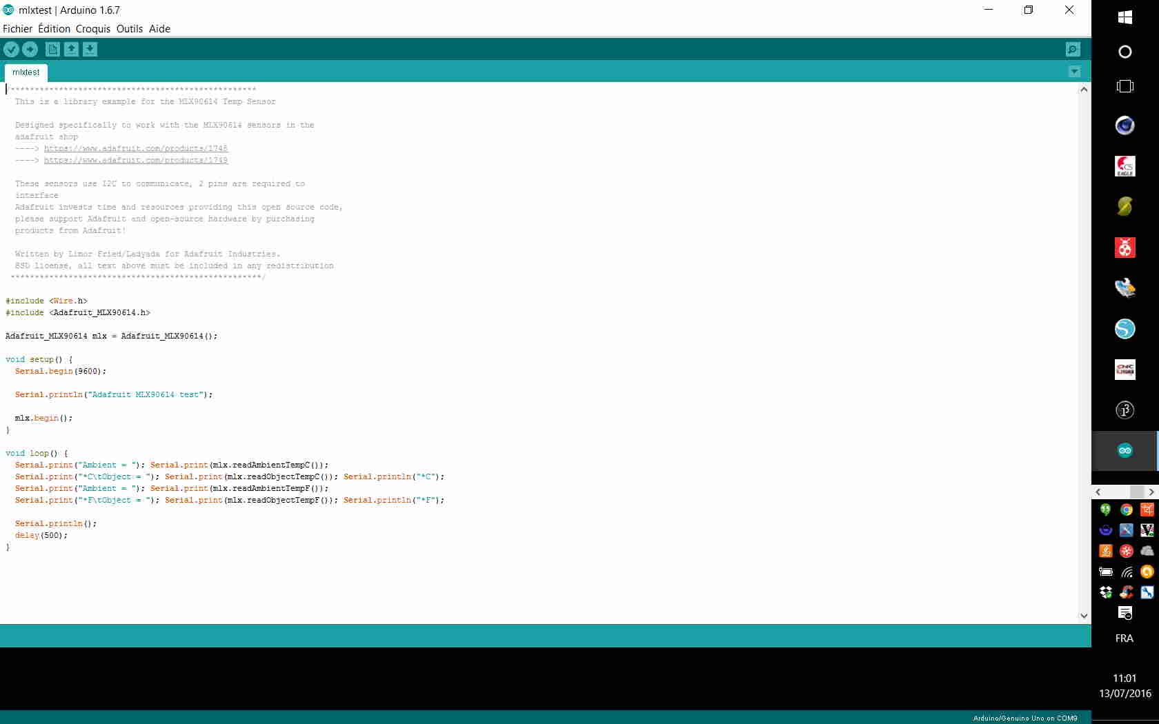 We did use the exmple provided in the library. And it worked !!!! It uses the wire and the MLX library, and prints, if following the schematics, both ambiant and contactless remote temperature. In Celcius and Farenheit, of course.