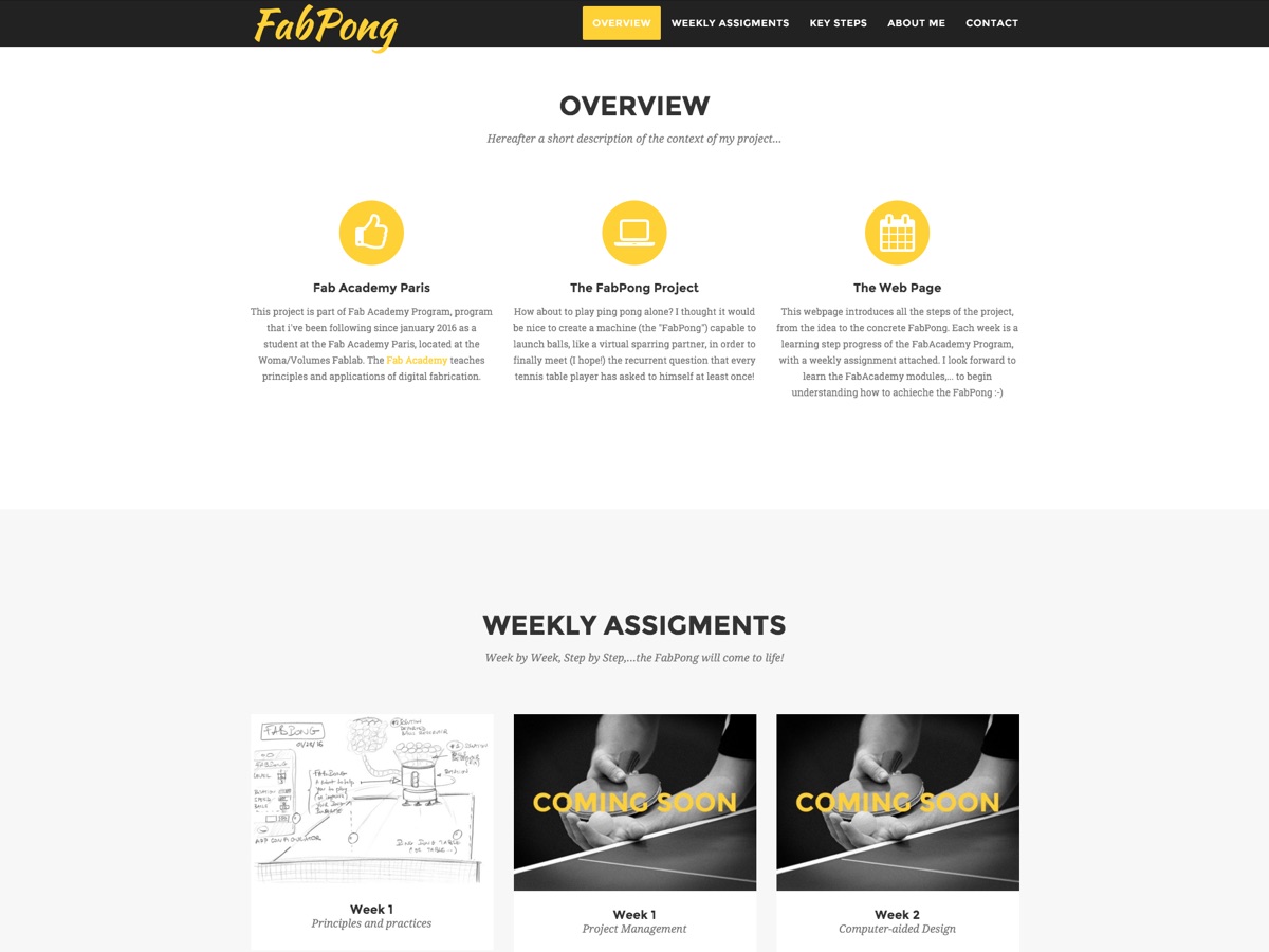 This webpage introduces all the steps of the project, from the idea to the concrete FabPong. Each week is a learning step progress of the FabAcademy Program, with a weekly assignment attached. I look forward to learn the FabAcademy modules,... to begin understanding how to achieche the FabPong :-)