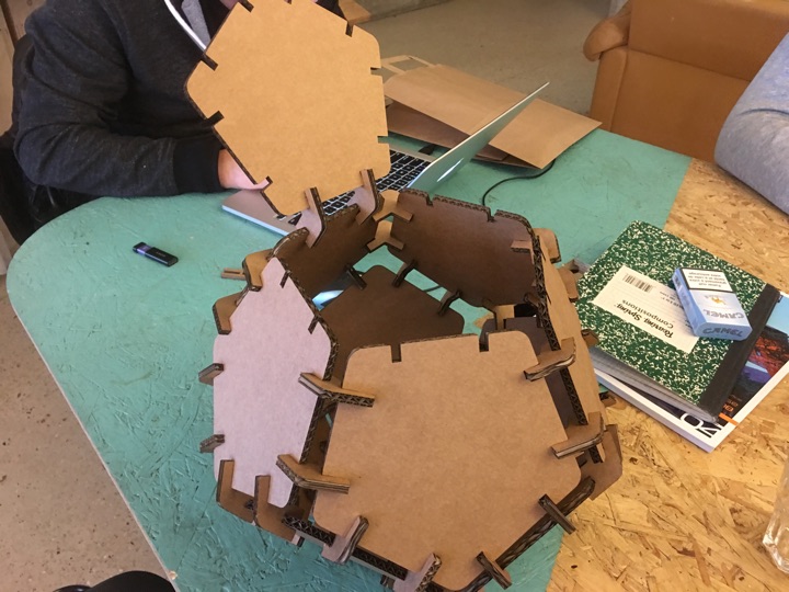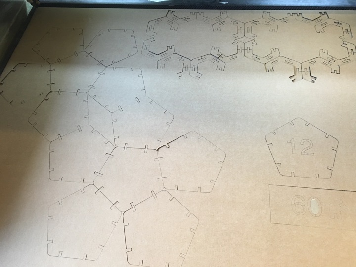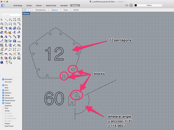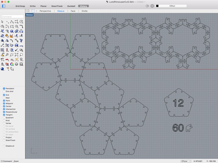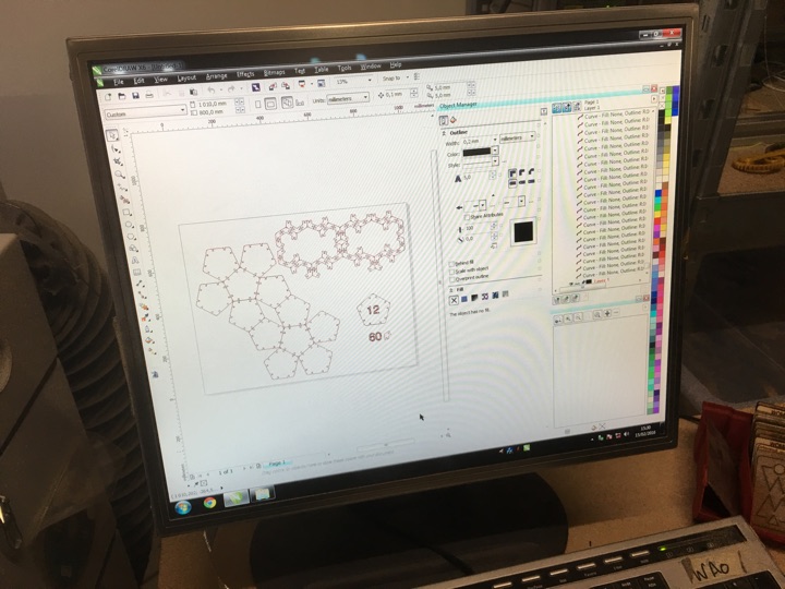 The first step is to modelize (on 2D) the shape of the dodecahedron for the wood or cartoon board which will be cut by the laser machine.