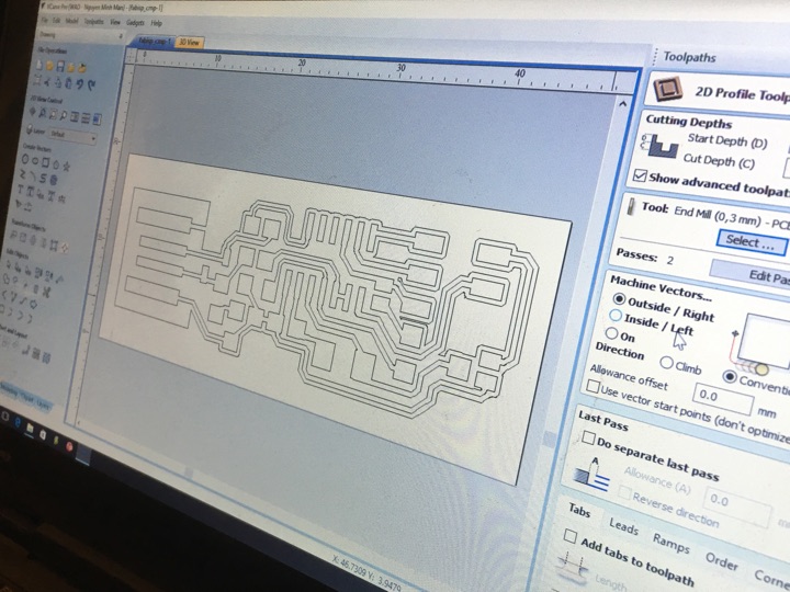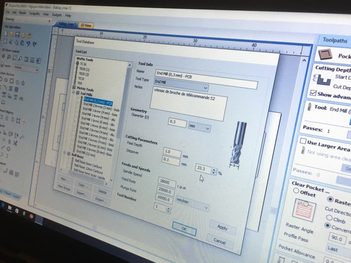 To engrave the coppered board, a CNC (Computer Numerical Control) milling machine is used to follow a precise course and to take off the unuseful copper. To execute the milling, the CNC must be propgrammed.