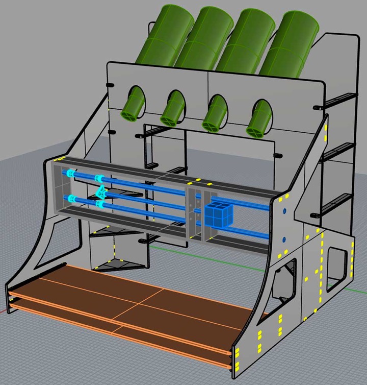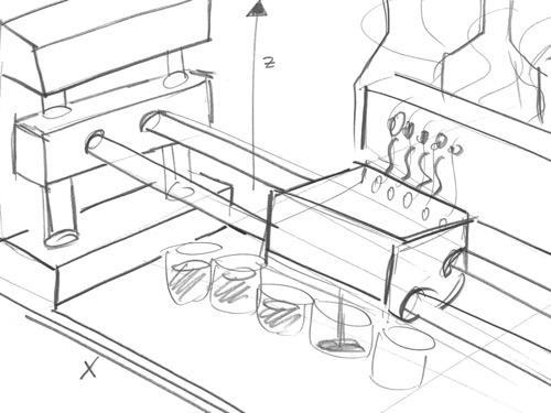 Many ideas have emerged and finally we decided to set up a machine capable to make some short drinks,... A sort of cocktail machine which can fill a line of small glasses with alcoholic liquid to create shooters ;-).
