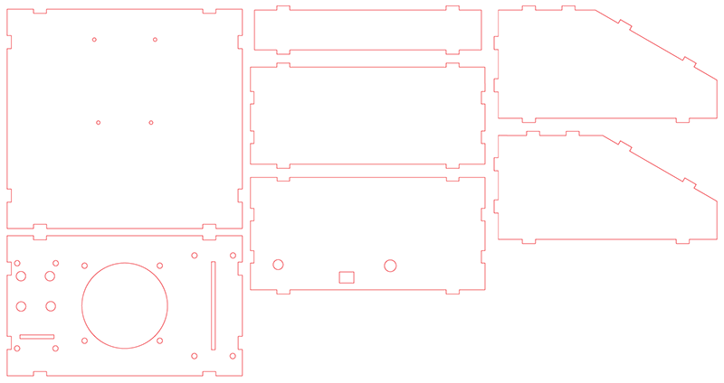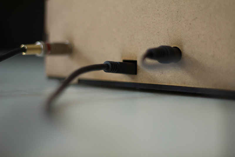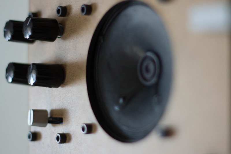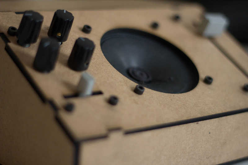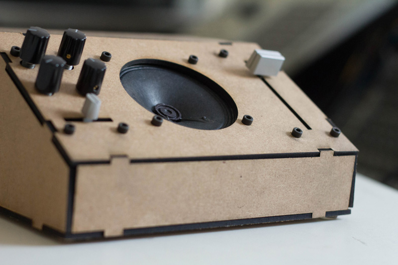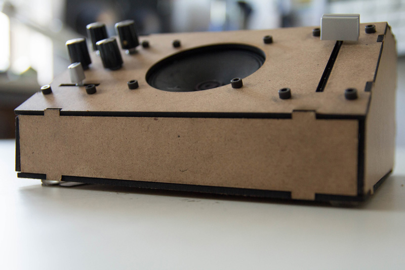 The enclosure was laser cut out of 1/8" hardwood and made using press-fit construction techniques (cf. entangle_xm.pdf), which allows easy access to the circuits and hassle-free maintenance and upgradability—no tools necessary.