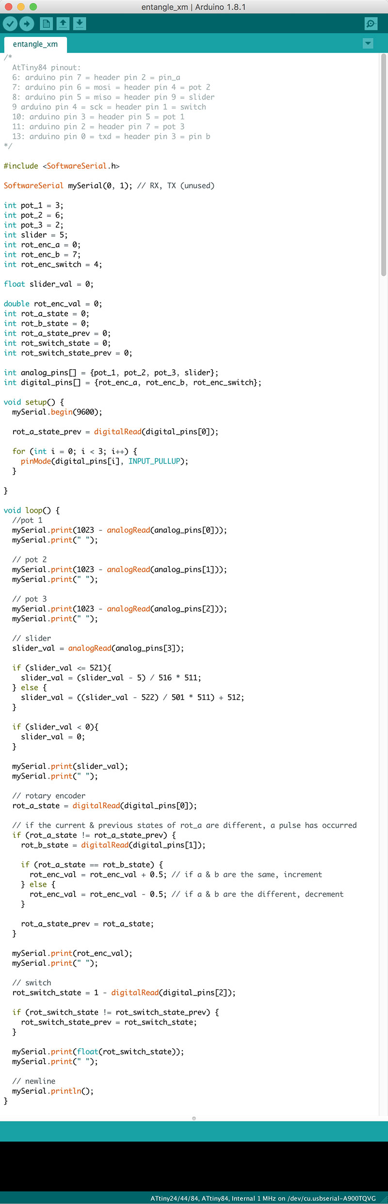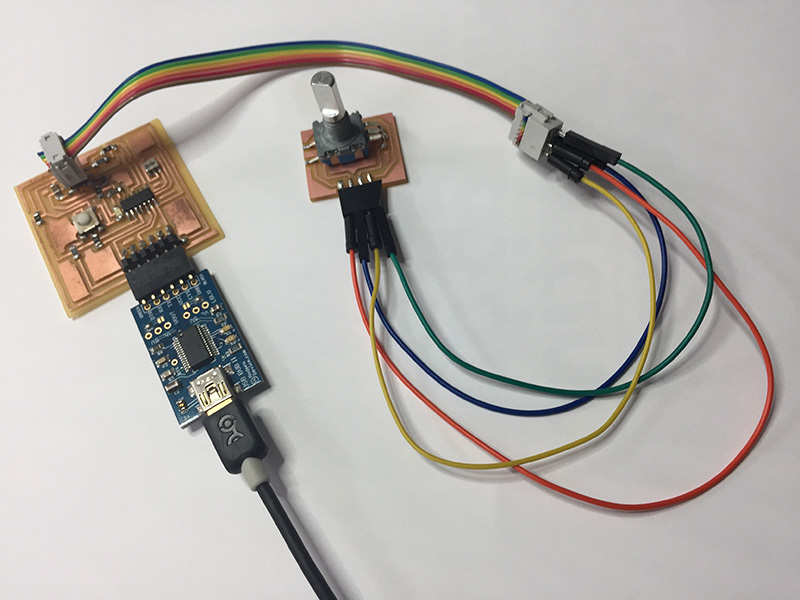 I used Modern Device’s BUB II USB to TTL serial adapter to interface between the computer and rotary encoder / AtTiny84 board, which hosted the code as seen in Week 13.