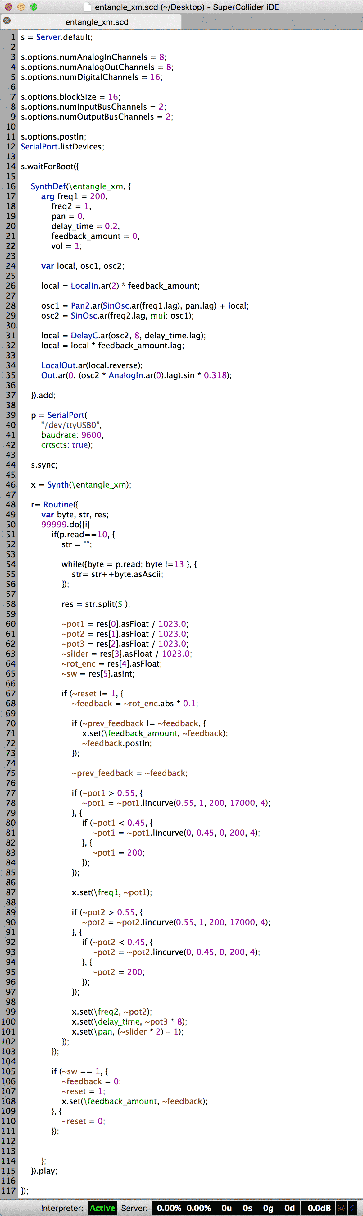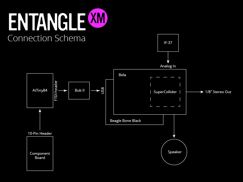 The software for this instrument is written in SuperCollider (cf. entangle_xm.scd) and runs on the Bela platform (Xenomai Linux on a BeagleBone Black board) for ease of updating via the browser-based IDE (over USB) and ultra-low latency (~100μs).