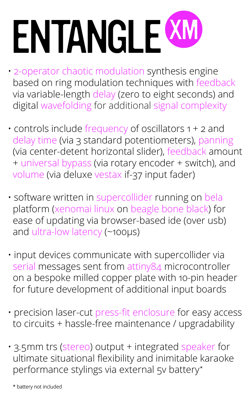 My final project is an electronic instrument entitled EntangleXM. It features 2-operator chaotic synthesis engine based on ring modulation techniques with feedback via a variable-length delay line (0–8 seconds) and digital wavefolding for additional signal complexity.