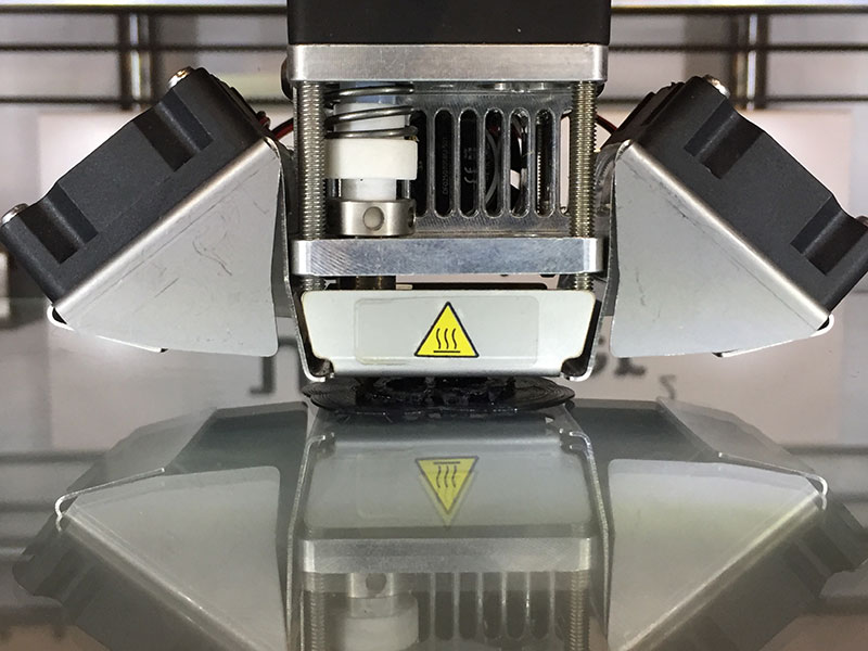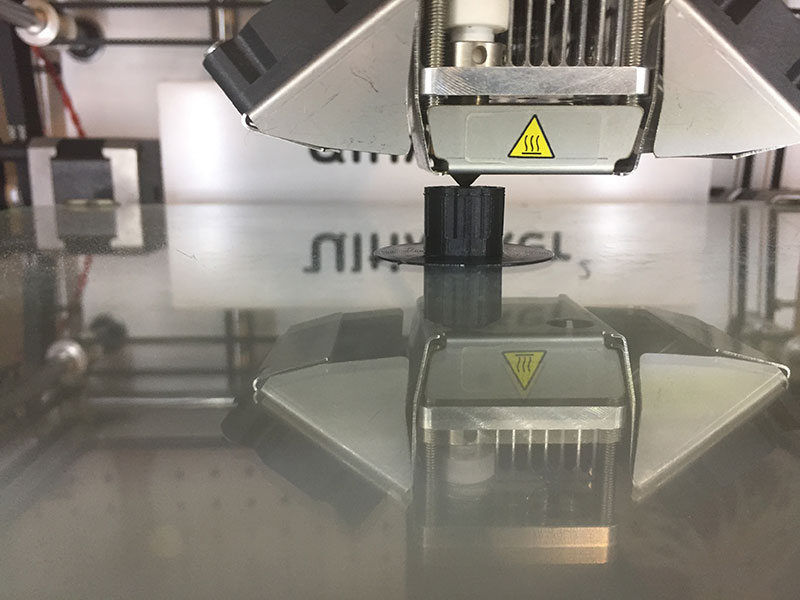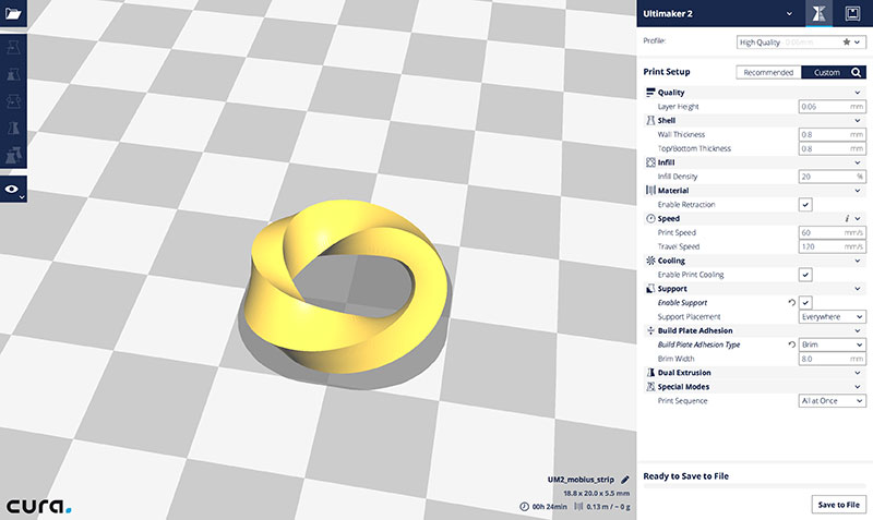 I then 3D printed it using AS220's Ultimaker 2 3D printer using Cura with a Layer Height of 0.06mm, Shell Wall Thickness of 0.8mm, Shell Top/Bottom Thickness of 0.8mm, Infill Density of 20%, Print Speed of 60mm/s, Travel Speed of 120mm/s, and Material Retraction Enabled, Print Cooling, and Support (placed Everywhere) enabled; the Build Plate Adhesion Type was set to Brim with an 8.0mm Brim Width, and the Print Sequence was set to All at Once.