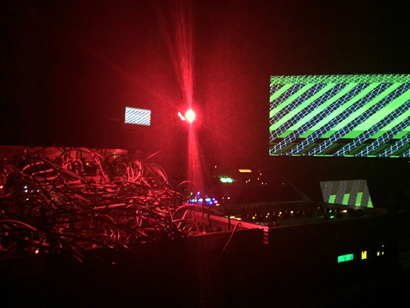 The video software is currently self-contained, and requires no external controls, other than a stereo audio output, which is analyzed and the resulting data used to drive various processes. The audio software is controlled using a Vestax VCM-600 USB MIDI controller, custom software running on an iPhone written using OpenFrameworks, and a handful of knobs, switches, and slide potentiometers with center detents taken from Technics 1200 turntables, the outputs of which are passed to SuperCollider via an Arduino using the Simple Message System for serial communication.