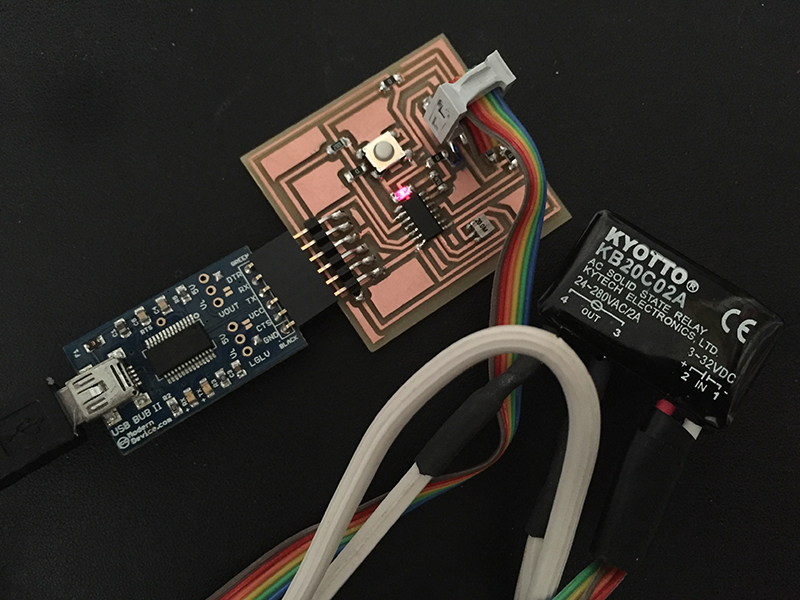 Made a site-specific flicker device using a KYOTTO KB20C02A solid state relay + the AtTiny84 board I milled in Week 8.