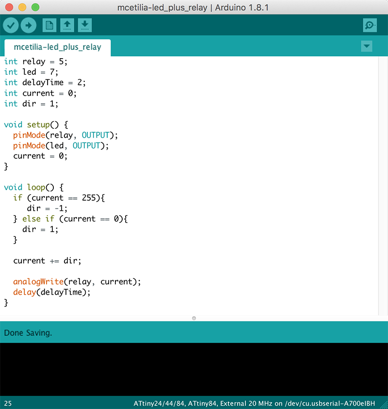 The code for the AtTiny84 board is fairly straightforward: in the setup() function, the relay is set as an output, while in the loop() function, a test is run to see if a counter (named “current”) has reached a value of 255 (having previously been instantiated with a value of 0). If it has, it will be decremented by 1 through each pass of the loop() function; if not, it will be incremented by 1 through each pass of the loop() function. Once this value has been established, the result is written to the relay pin, and held for a given number of milliseconds (in this case, 2).
