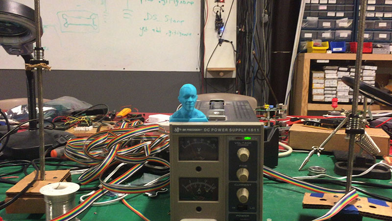 We also made a 3D scan of my head using the Sense 3D scanner and Sense software. In order to get a full 3D model, we used a (human-scale) Lazy Susan, which I stood on, and was rotated upon while being scanned. We didn't completely capture the top of my head on the first scan, so we ran it again, being sure to angle the scanner up and over on each pass to get full coverage.