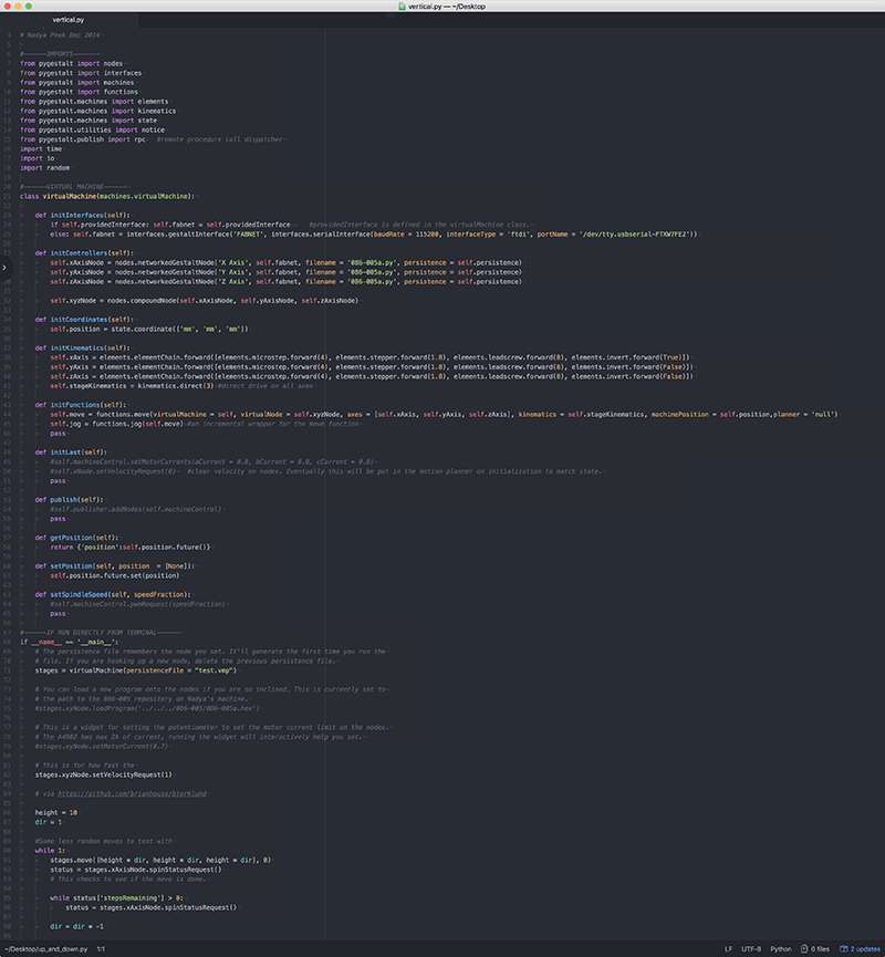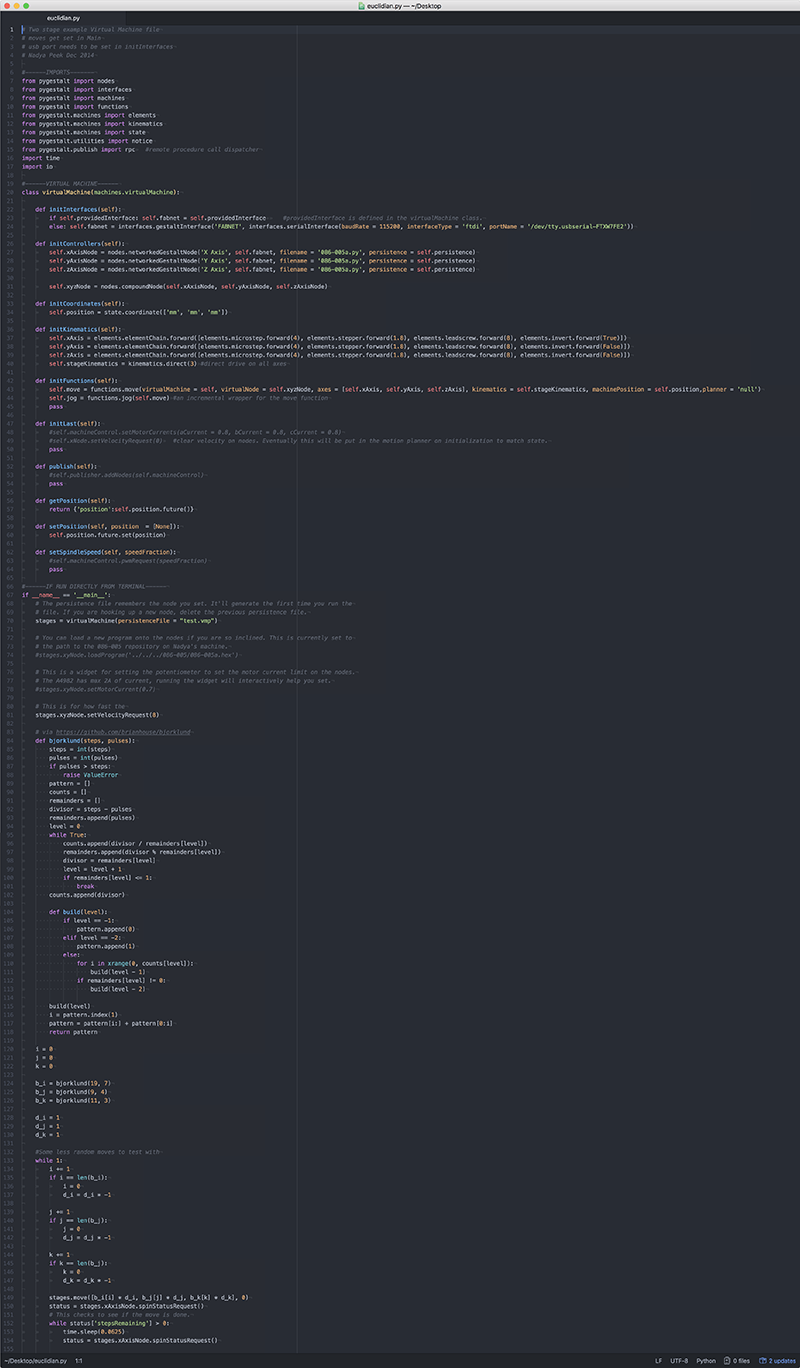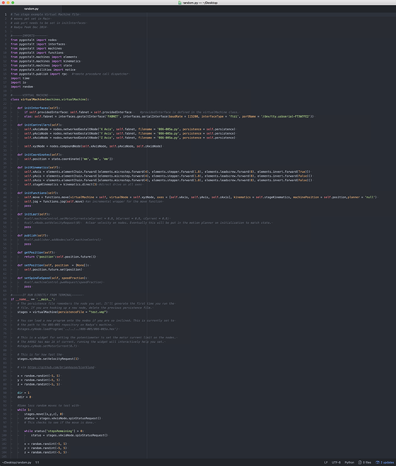 In heading towards an electronically-driven iteration of the machine, I helped begin the process of making the interconnects and cables for communication between the boards, and took the opportunity to start digging a bit further into Python, as it is a language I have only ever really brushed the surface of, and want to get a deeper understanding of its conceptual underpinnings; the Gestalt Nodes we will be using for the final version of the machine are controlled using Python.