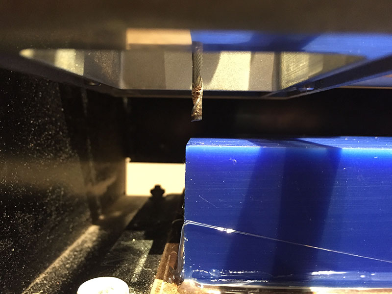 In order to set up the job, I first added drill holes in VCarve to the middle of each slice (thus avoiding the necessity of cutting out tabs by hand at the end of the job), and tacked down the full sheet to the bed of the CNC.