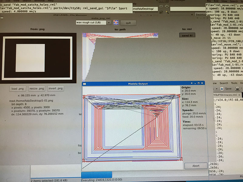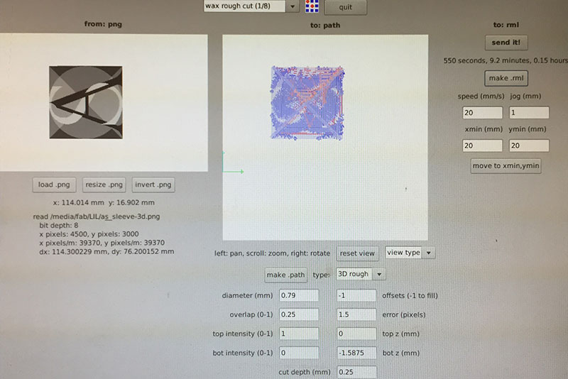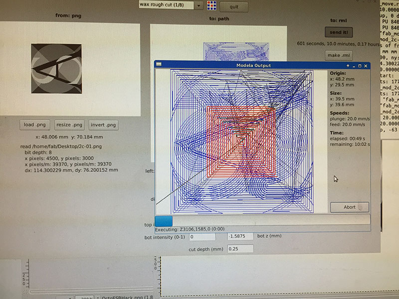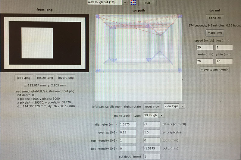 For milling the wax, I first did one pass for the outside area with the Fab Modules’ “wax rough cut (1/8)” settings as a starting point but with a 1/16" (1.5875mm) end mill, a cut depth of 0.25mm and a total depth of 1/16" (diameter = 1.5875mm, offsets = -1, overlap = 0.25, error = 1.5, top intensity = 1, top z = 0mm, bot intensity = 1, bot z = -1.5875mm, cut depth = 0.25mm, speed = 20mm/s, jog = 1.0mm).