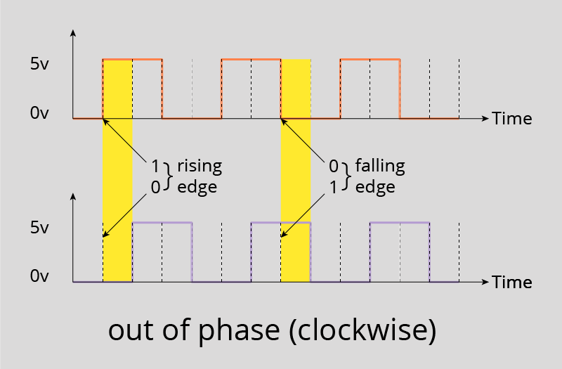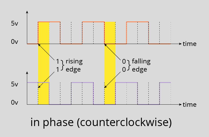 Unlike traditional potentiometers, rotary encoders are not limited in their range of motion, but may turn continuously in either direction, and produce 2-bit Gray codes (named after Frank Gray, who patented this binary numeral system) to relay which direction they are being turned. When sampling the outputs of both pins, if both pins are the same value, that means that the rotary encoder has been turned counterclockwise; if they are opposite values, that means it has been turned clockwise.