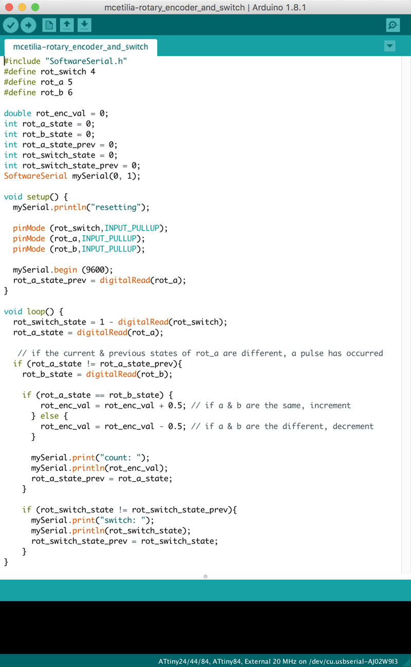 Decoding the Gray Code was accomplished by setting two of the AtTiny84’s pins, rot_a and rot_b, to accept inputs (with their pullup resistors enabled) in the setup() function. In the loop() function, a variable called rot_a_state is set based on the input of rot_a using the digitalRead() function. If this variable is different from the value stored in a variable called rot_a_state_prev during the last pass through the loop, then we know that someone has turned the knob one way or the other. If the values are the same, that means that the knob has been turned clockwise, so we increment a variable called rot_enc_val by 0.5 (since we will get changes on both sides of the knob turn, this allows us to see when the knob has been turned partway). If the values are different, the knob has been turned counter-clockwise, and rot_enc_val should be decremented by 0.5.