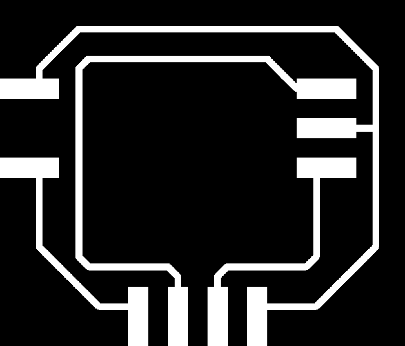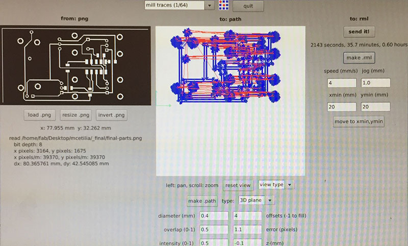 For milling the traces, I used the Fab Modules’ “mill traces (1/64)” settings (diameter = 0.4mm, offsets = 4, overlap = 0.5, error = 1.1, intensity = 0.5, z = -0.1 mm, speed = 4mm/s, jog = 1.0mm) and a 1/64" end mill, but with a slight alteration: I had to set the diameter to 3.6 instead of the default 0.4 in order to cut the .