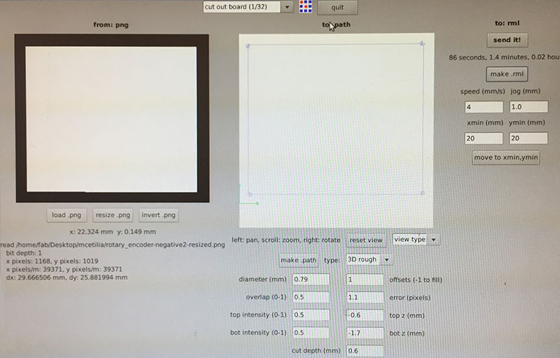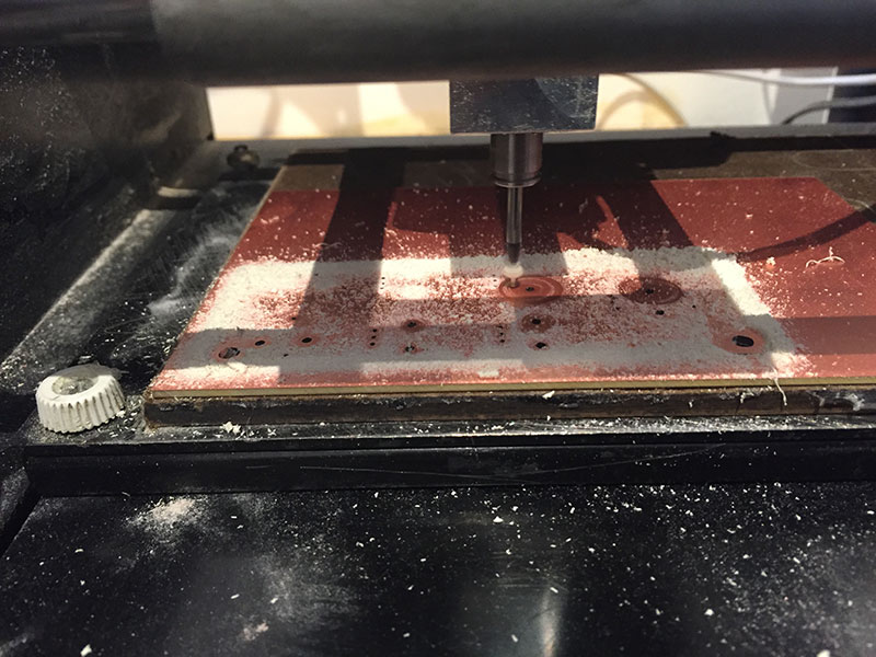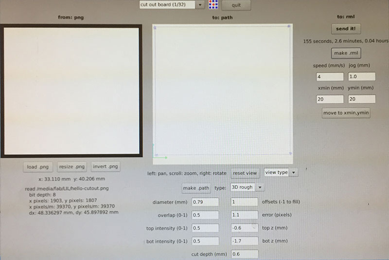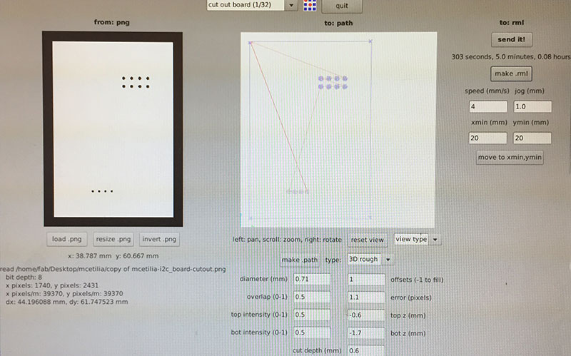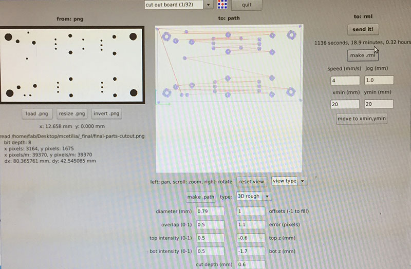 For cutting out the board, I used the Fab Modules’ “cutout board (1/32)” settings (diameter = 0.79mm, offsets = 1, overlap = 0.5, error = 1.1, top intensity = 0.5, top z = -0.6mm, bot intensity = 0.5, bot z = -1.7mm, cut depth = 0.6mm, speed = 4mm/s, jog = 1.0mm) and a 1/32" end mill.